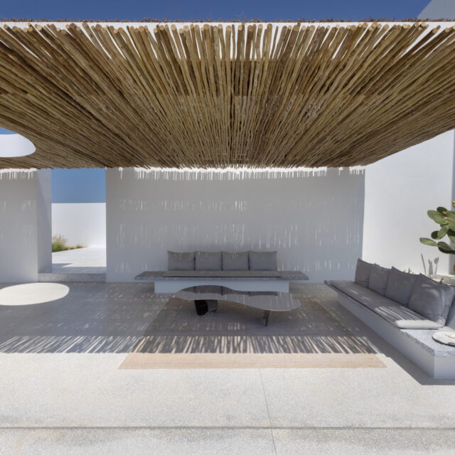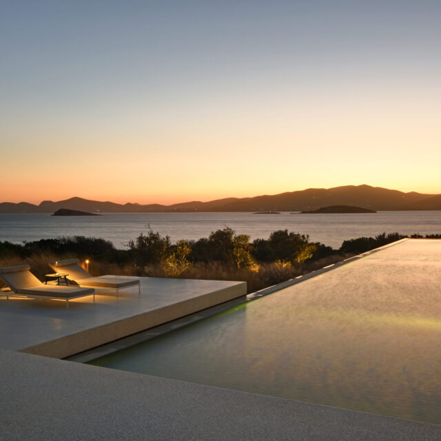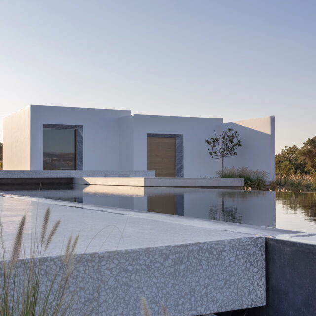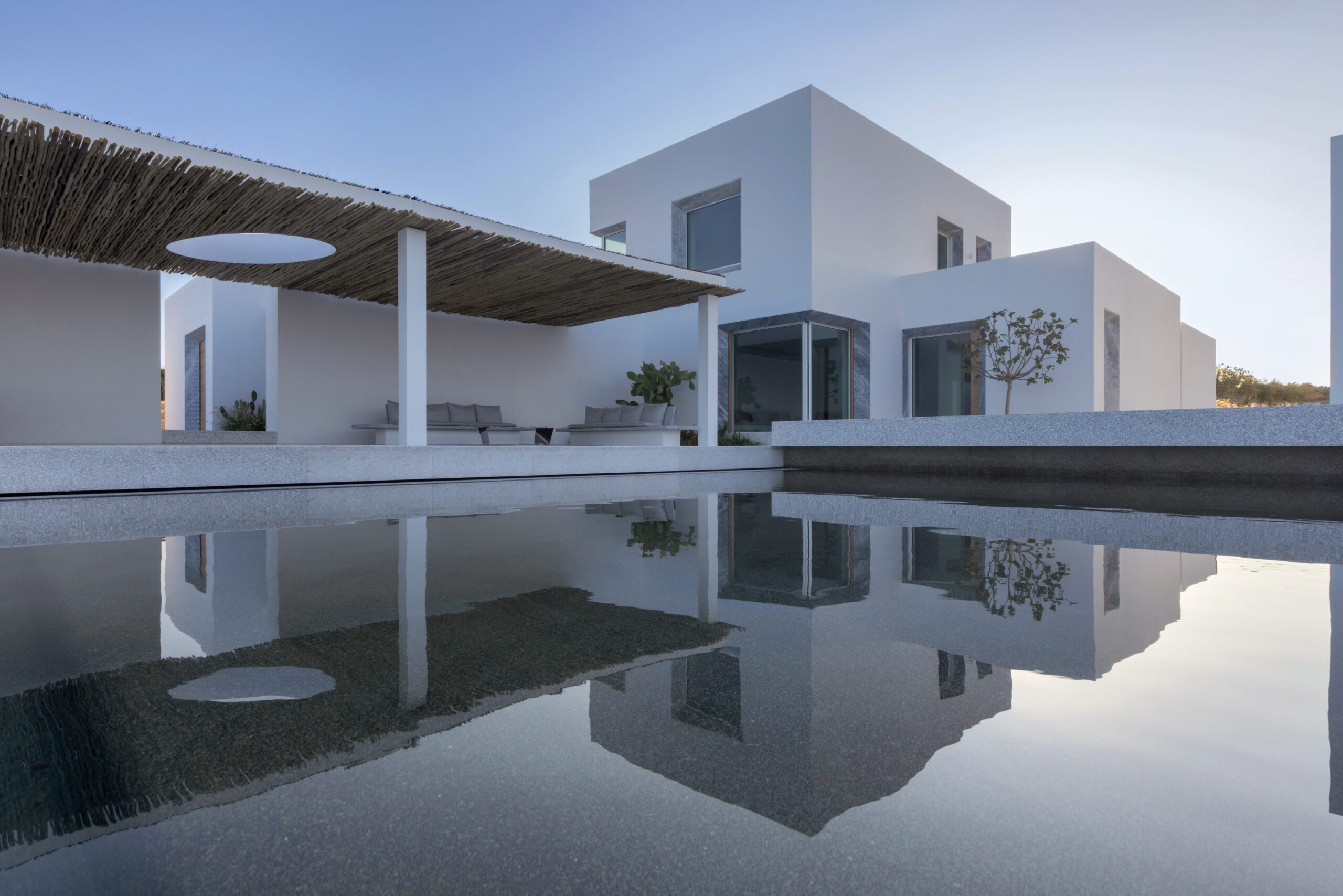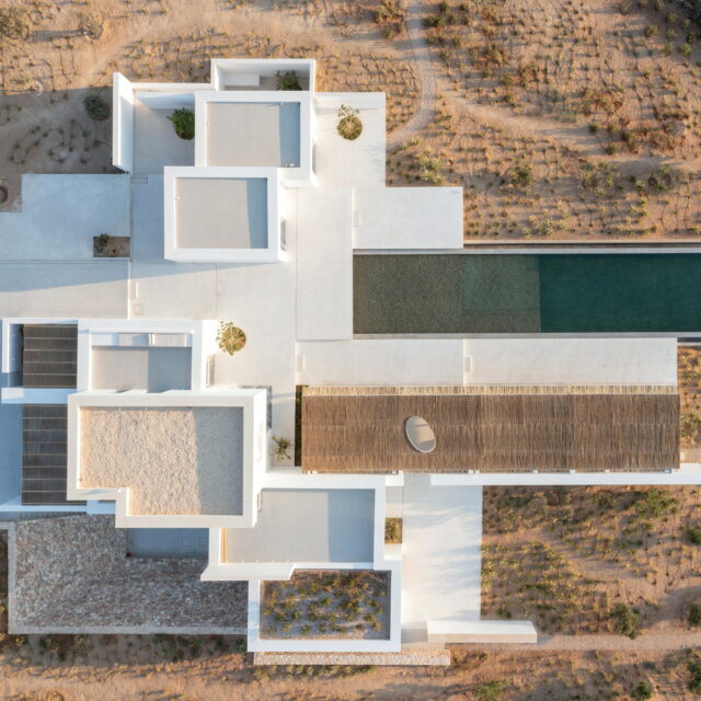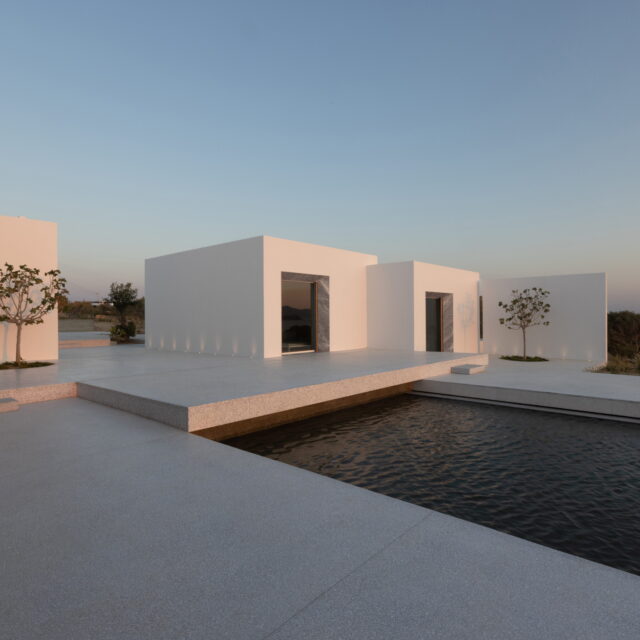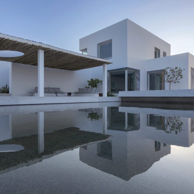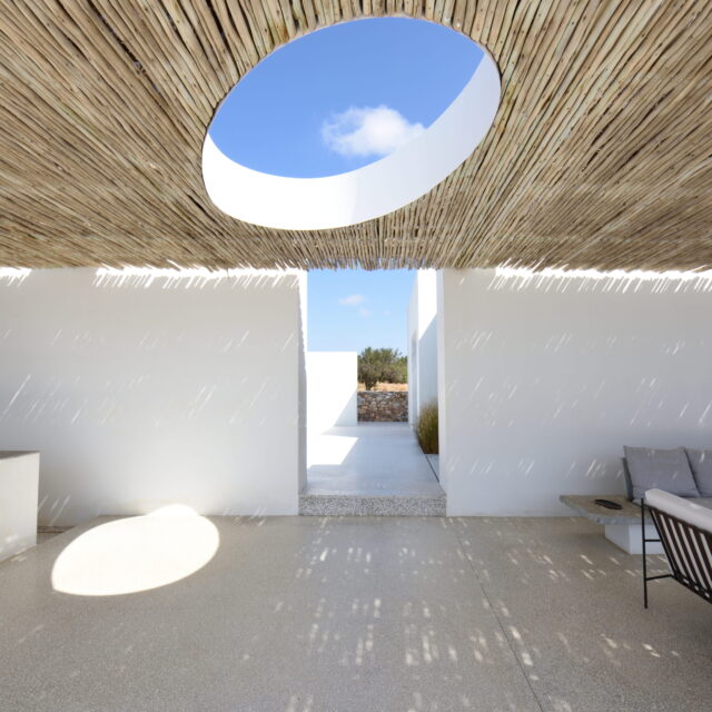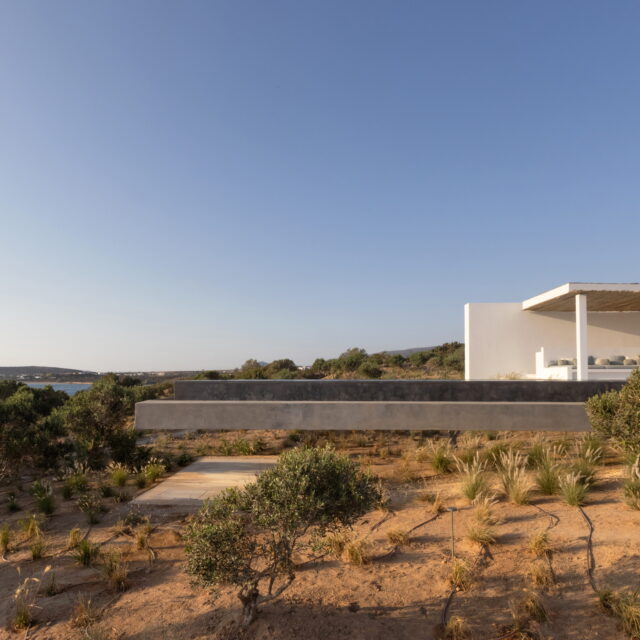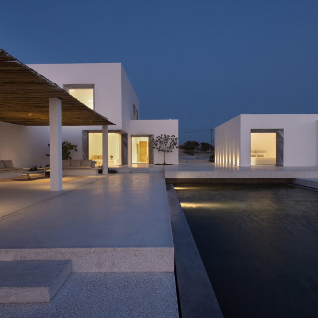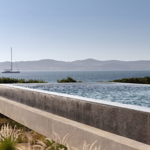 Rising above an olive grove on the serene west side of Paros, this private residence is centred on the setting of the August sun. The solar axis is described by a linear path that terminates at a negative-edge pool cantilevering into the Aegean blue. This linearity is mirrored by the adjacent pergola – a gently undulating wave of bamboo punctured by a single oculus that brings light onto a chiselled marble poolside lounge. Around this end of the pool, the built volumes touch gently upon the earth on overlapping terrazzo slabs, which ‘float’ above the soil. The airy sensation culminates around the pool. Clad in rustic mirrors, the inset base reflects the Mediterranean landscape and transforms the pool into yet another floating slab.