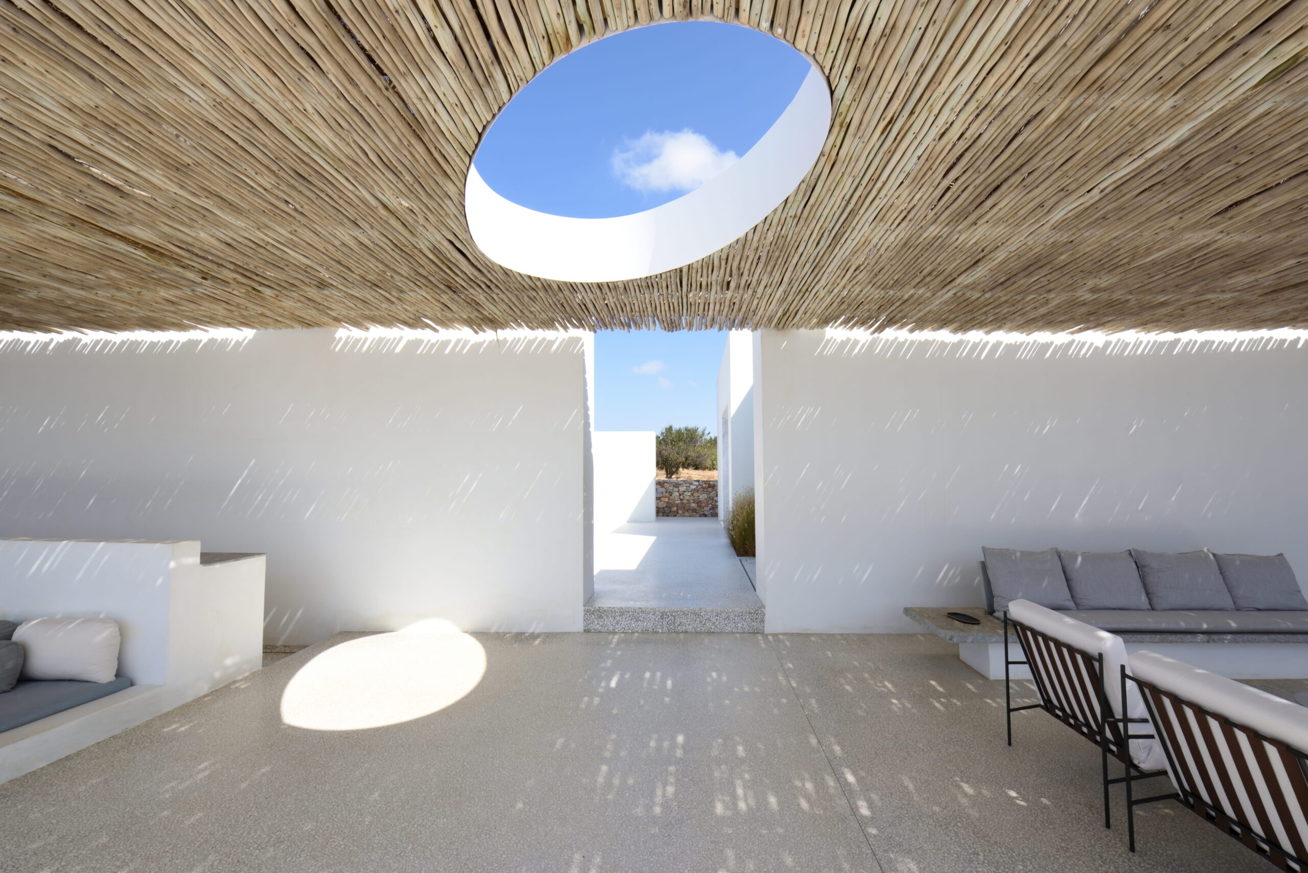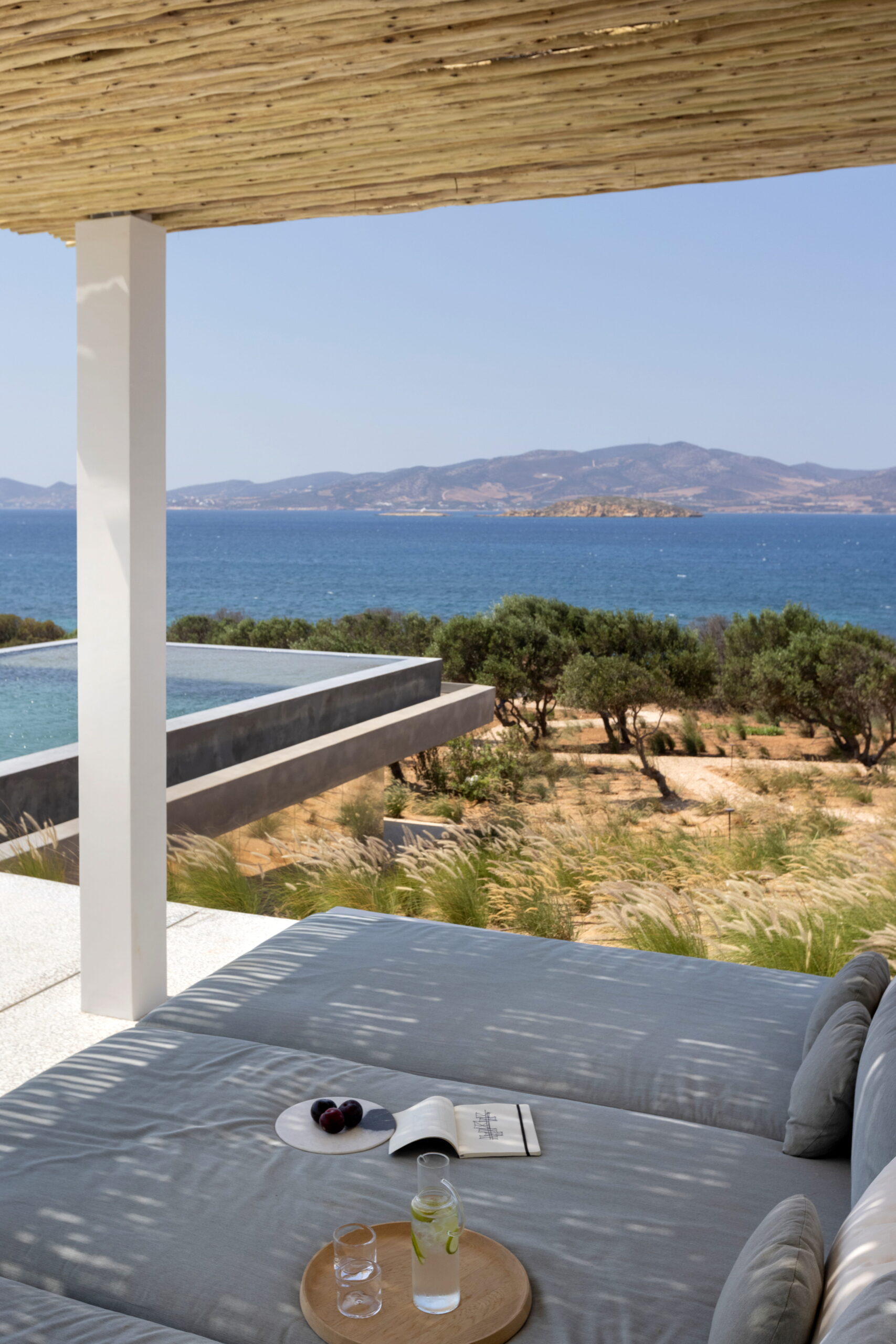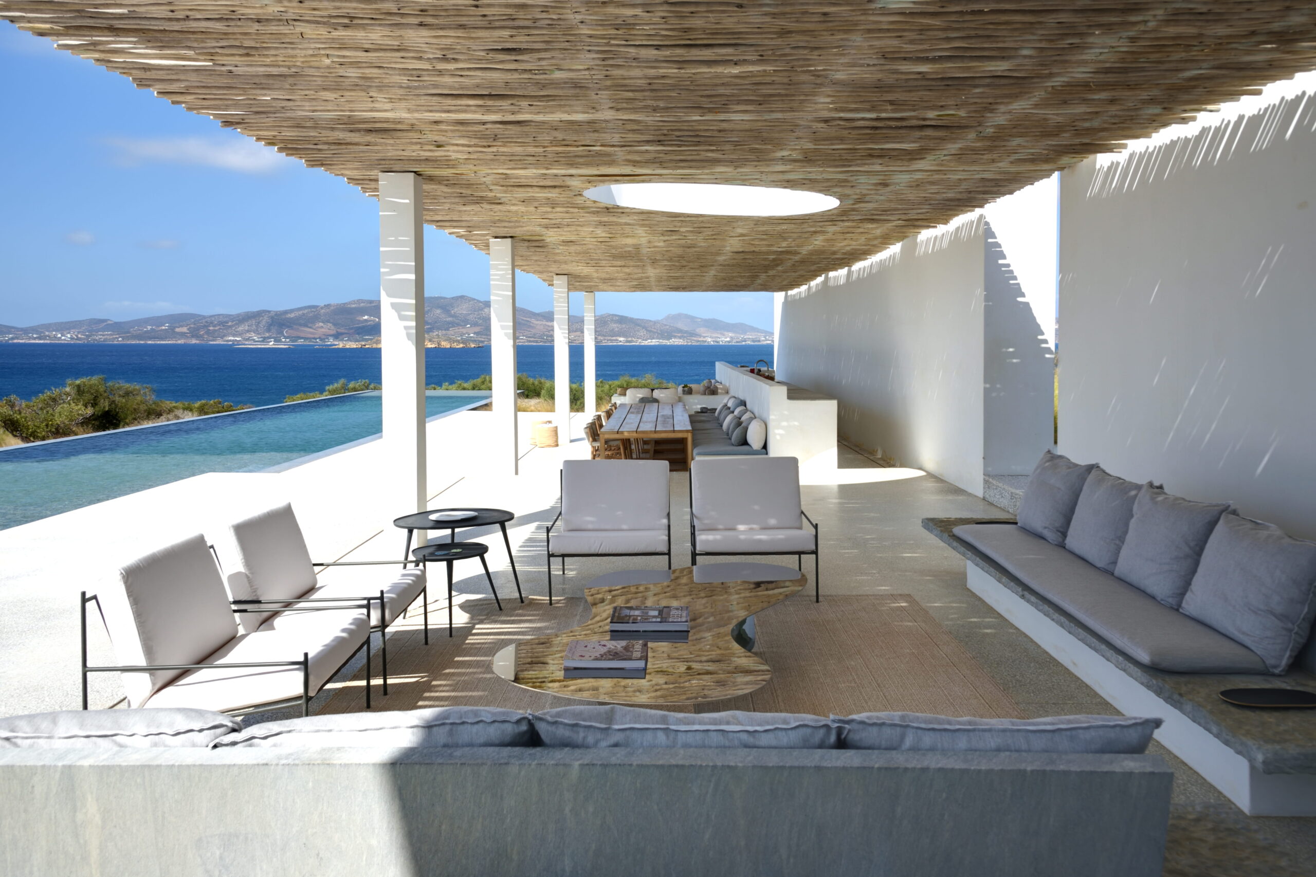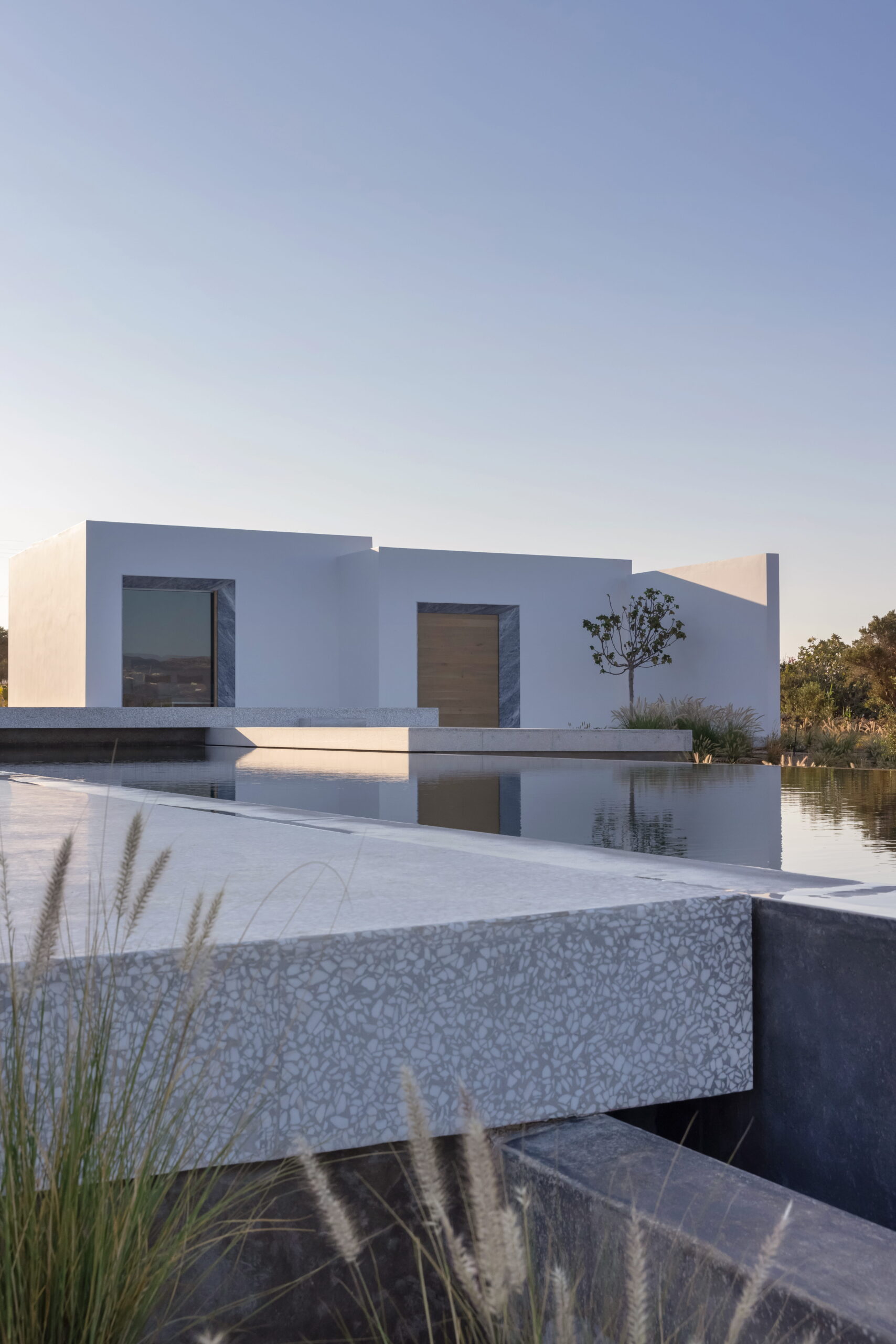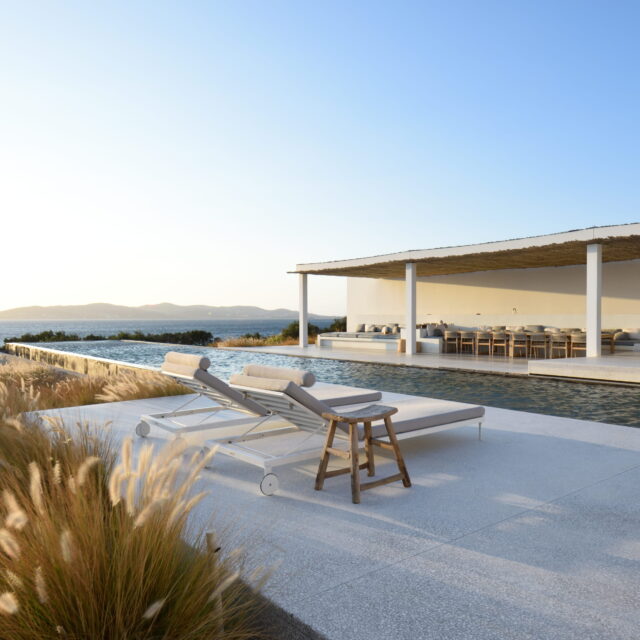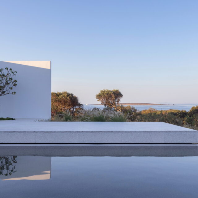 Rising above an olive grove on the serene west side of Paros, this private residence is centred on the setting of the August sun. The solar axis is described by a linear path that terminates at a negative-edge pool cantilevering into the Aegean blue. This linearity is mirrored by the adjacent pergola – a gently undulating wave of bamboo punctured by a single oculus that brings light onto a chiselled marble poolside lounge. Around this end of the pool, the built volumes touch gently upon the earth on overlapping terrazzo slabs, which ‘float’ above the soil. The airy sensation culminates around the pool. Clad in rustic mirrors, the inset base reflects the Mediterranean landscape and transforms the pool into yet another floating slab.
