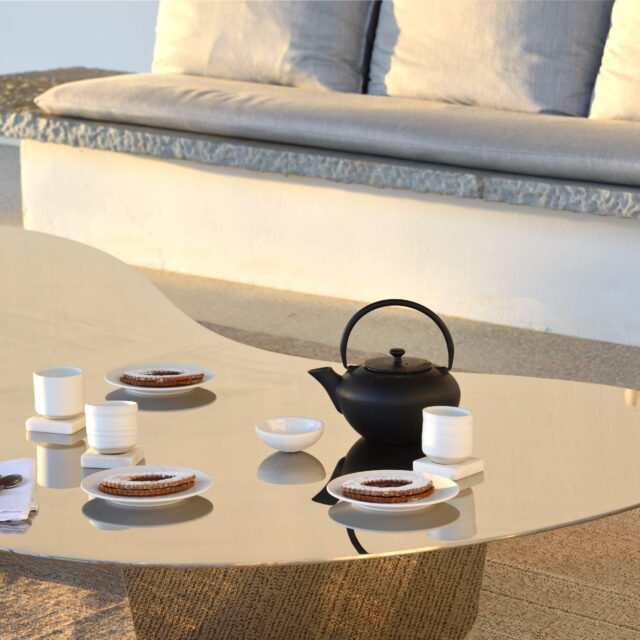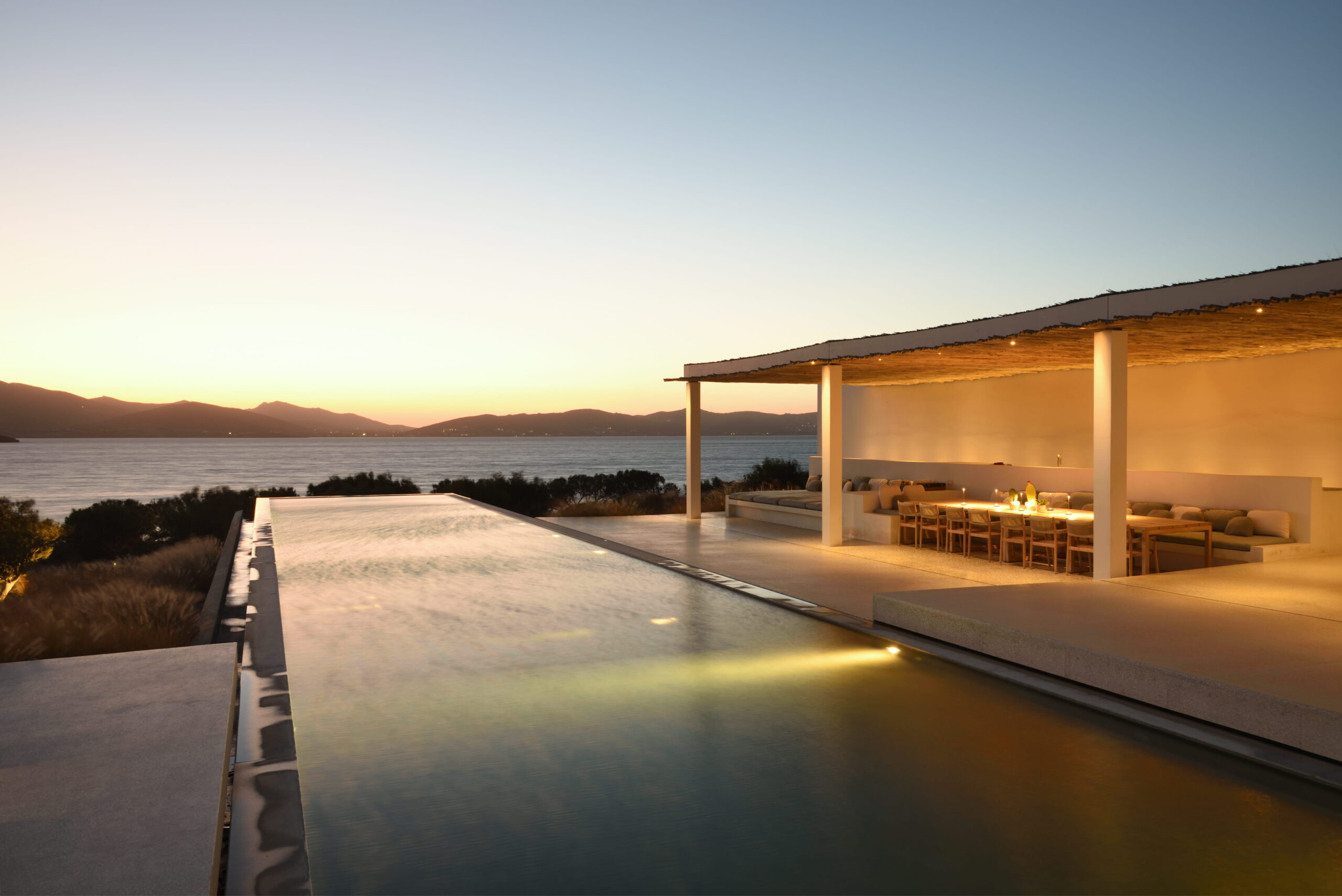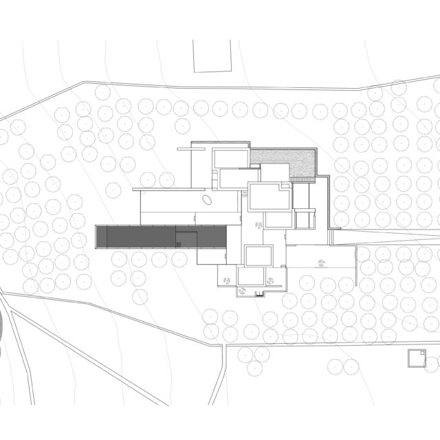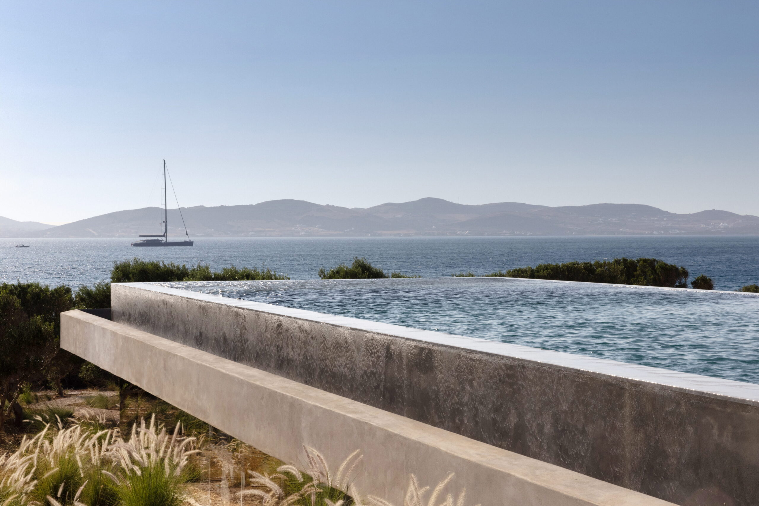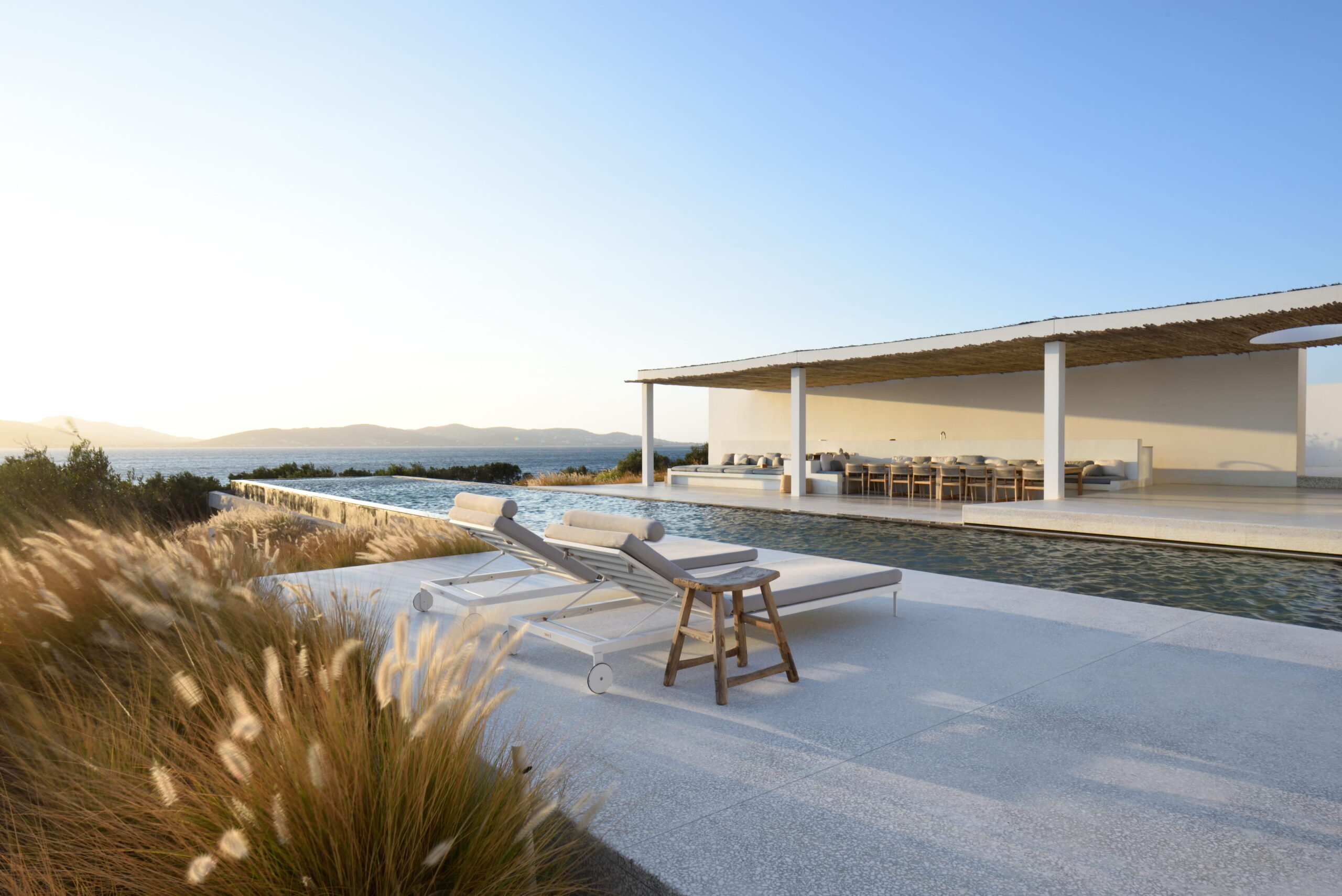 Rising above an olive grove on the serene west side of Paros, this private residence is centred on the setting of the August sun. The solar axis is described by a linear path that terminates at a negative-edge pool cantilevering into the Aegean blue. This linearity is mirrored by the adjacent pergola – a gently undulating wave of bamboo punctured by a single oculus that brings light onto a chiselled marble poolside lounge. Around this end of the pool, the built volumes touch gently upon the earth on overlapping terrazzo slabs, which ‘float’ above the soil. The airy sensation culminates around the pool. Clad in rustic mirrors, the inset base reflects the Mediterranean landscape and transforms the pool into yet another floating slab.