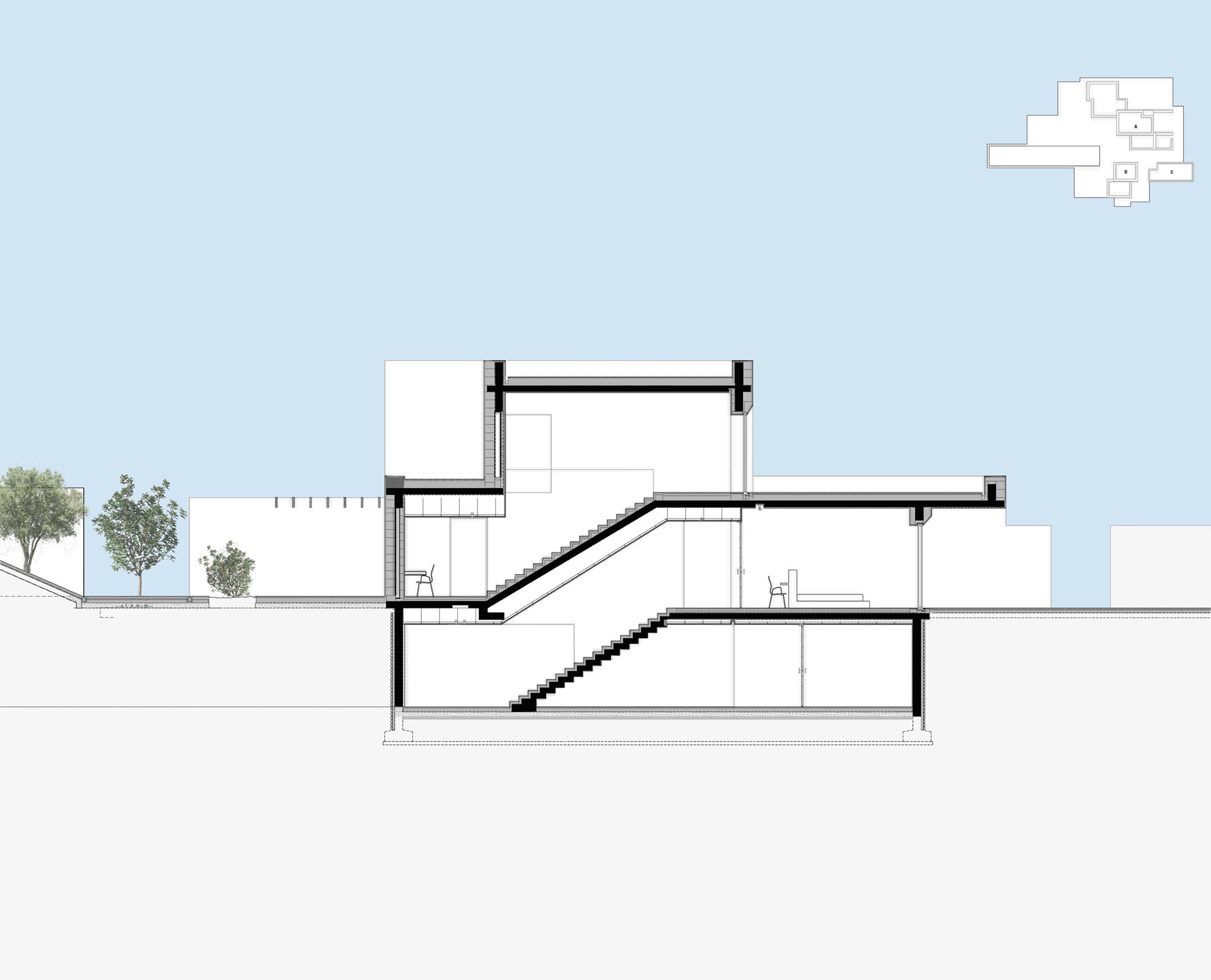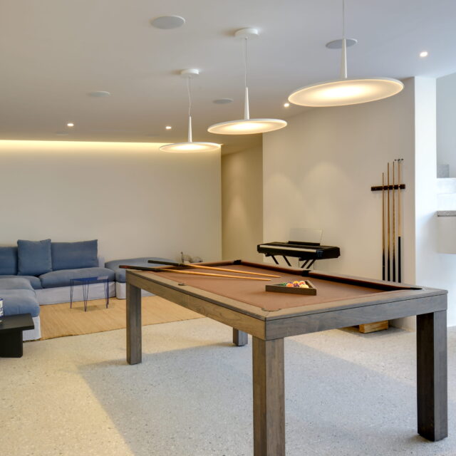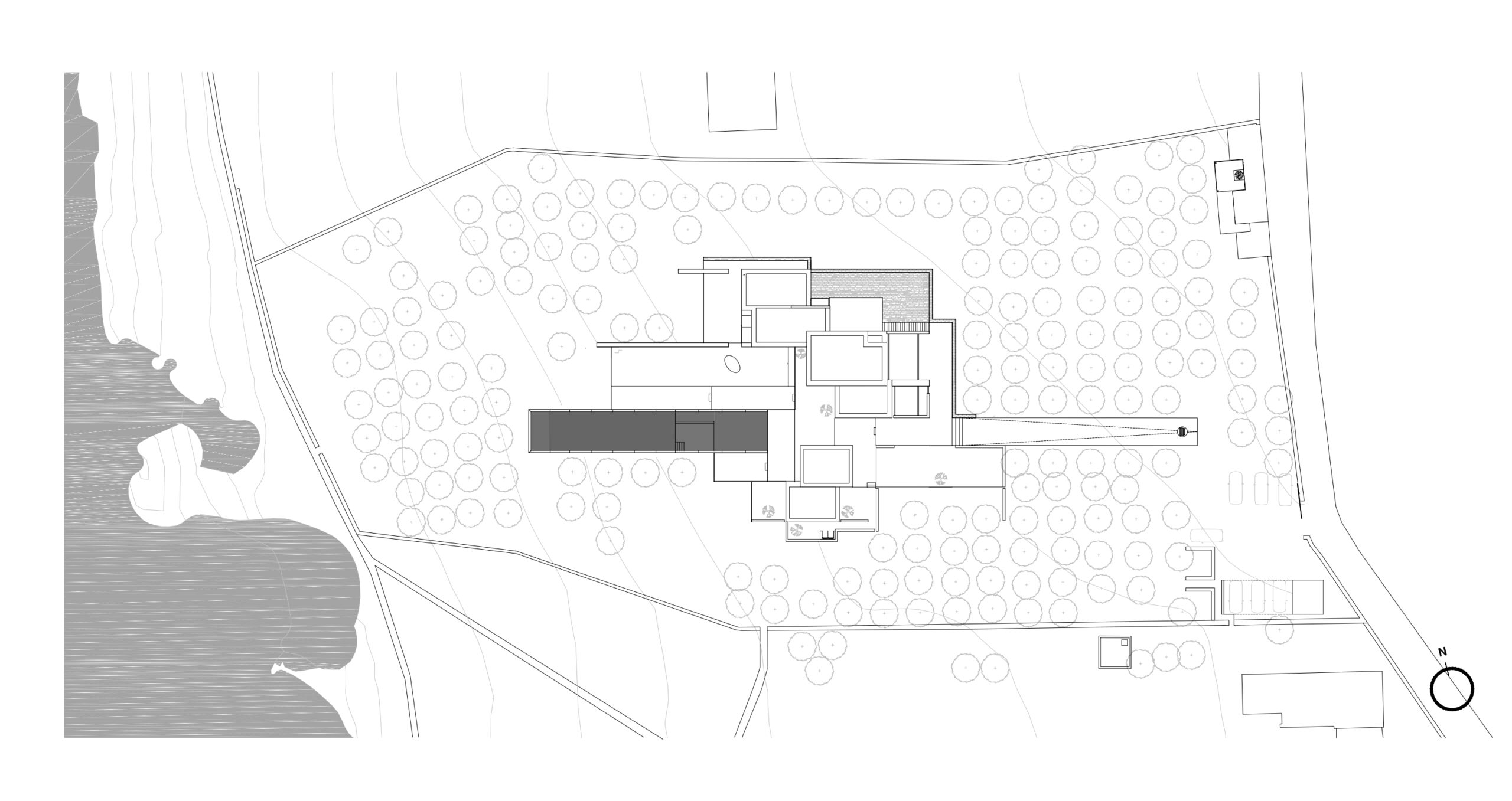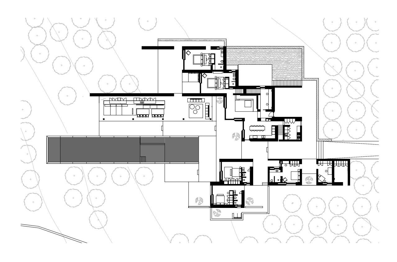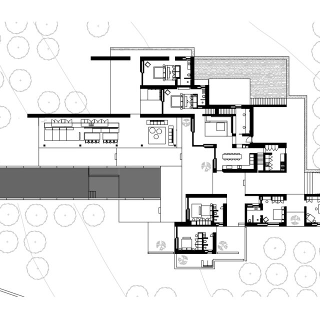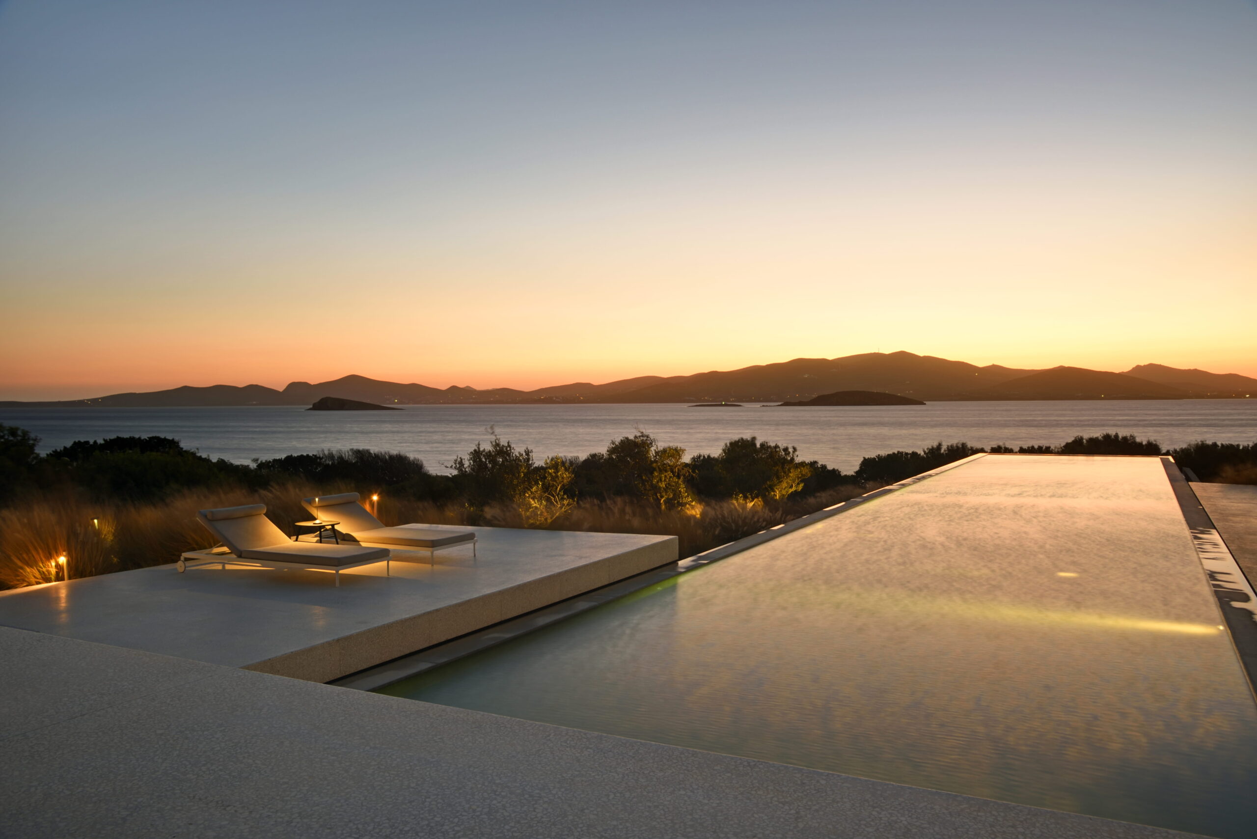 Rising above an olive grove on the serene west side of Paros, this private residence is centred on the setting of the August sun. The solar axis is described by a linear path that terminates at a negative-edge pool cantilevering into the Aegean blue. This linearity is mirrored by the adjacent pergola – a gently undulating wave of bamboo punctured by a single oculus that brings light onto a chiselled marble poolside lounge. Around this end of the pool, the built volumes touch gently upon the earth on overlapping terrazzo slabs, which ‘float’ above the soil. The airy sensation culminates around the pool. Clad in rustic mirrors, the inset base reflects the Mediterranean landscape and transforms the pool into yet another floating slab.