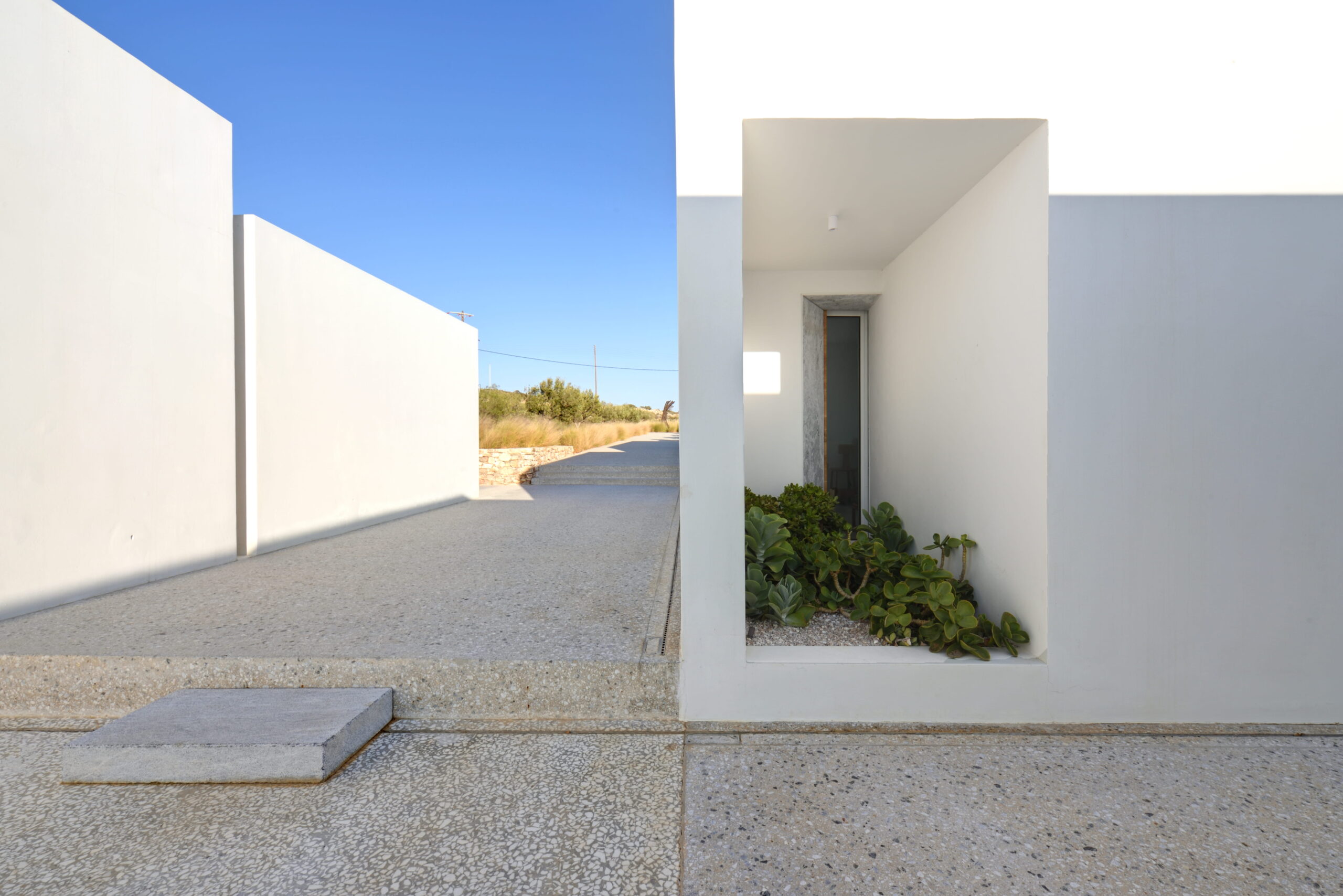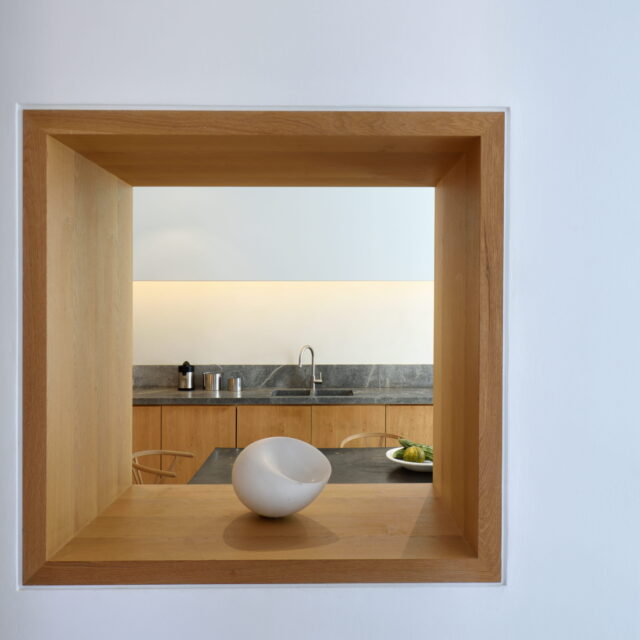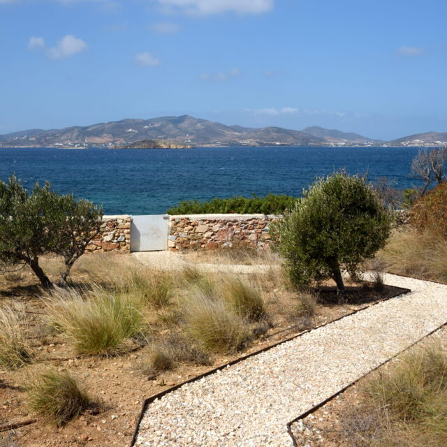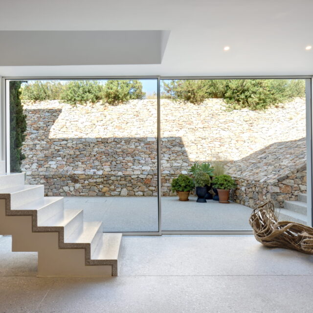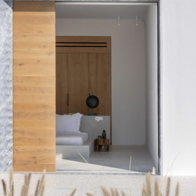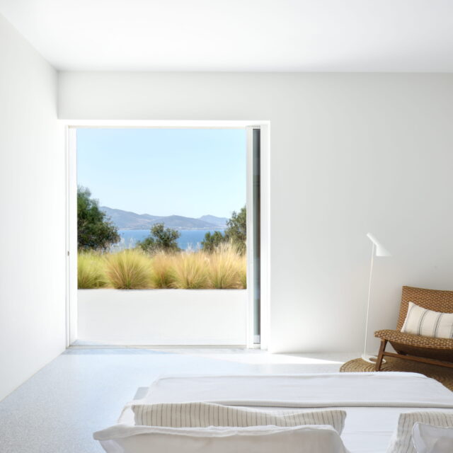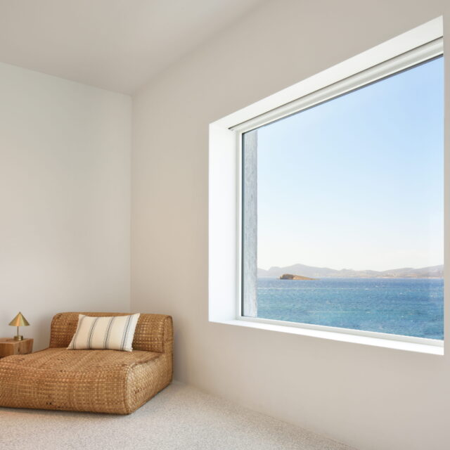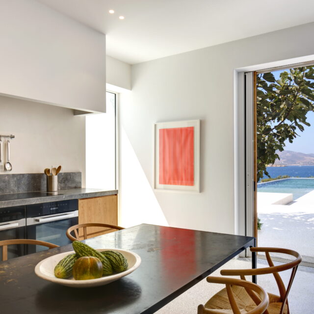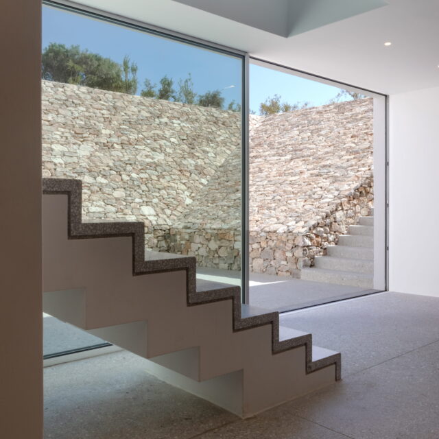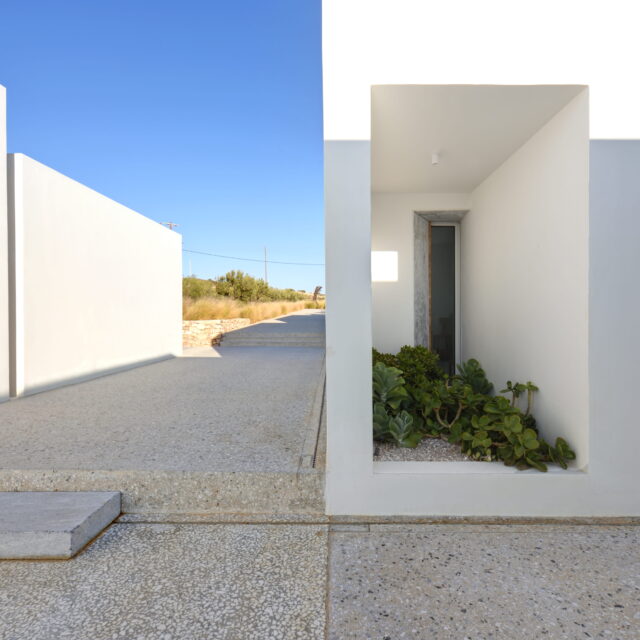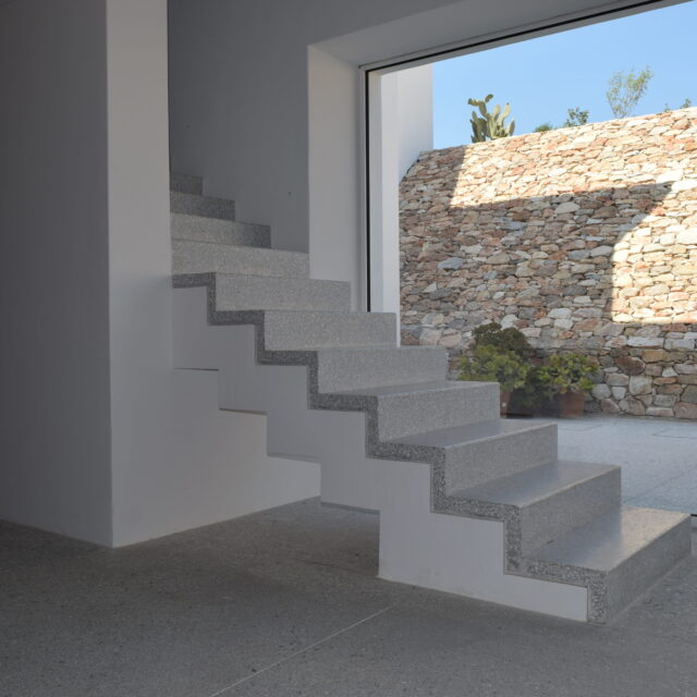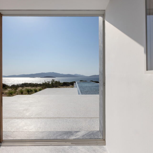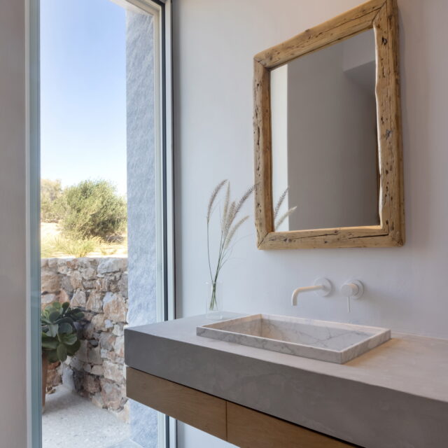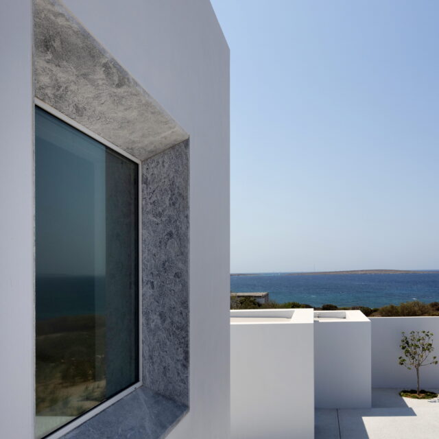 Just as the built elements are placed gently on the site, the material richness of the building is derived subtly by means of texture. Beyond the traditional white and stone walls, the materiality is augmented by Greek marble and terrazzo. The simplicity of these raw materials is the key to the intricacy of the project. The size of the stone aggregate displays calculated variation between different terrazzo surfaces, creating a subtle but vital gradation. The windows are framed by a densely hammered Aliveri marble, inspired by the decorative stone surround that marks the entrance of Parian churches, while counters and benches feature sandblasted and chiselled stone. These careful adjustments provide complexity without overloading the site, allowing the magic of the landscape to imbue the house with the unique energy for which we build by the seaside.
