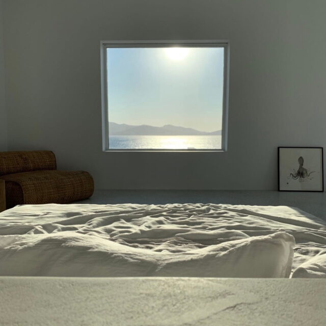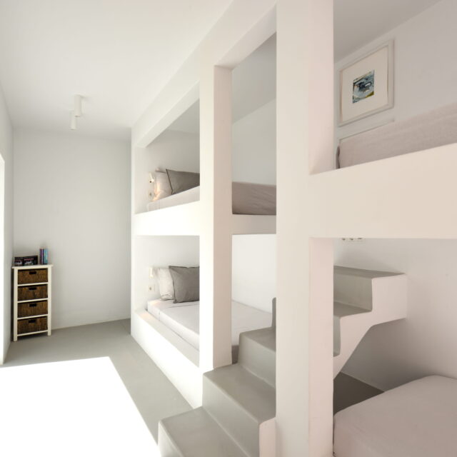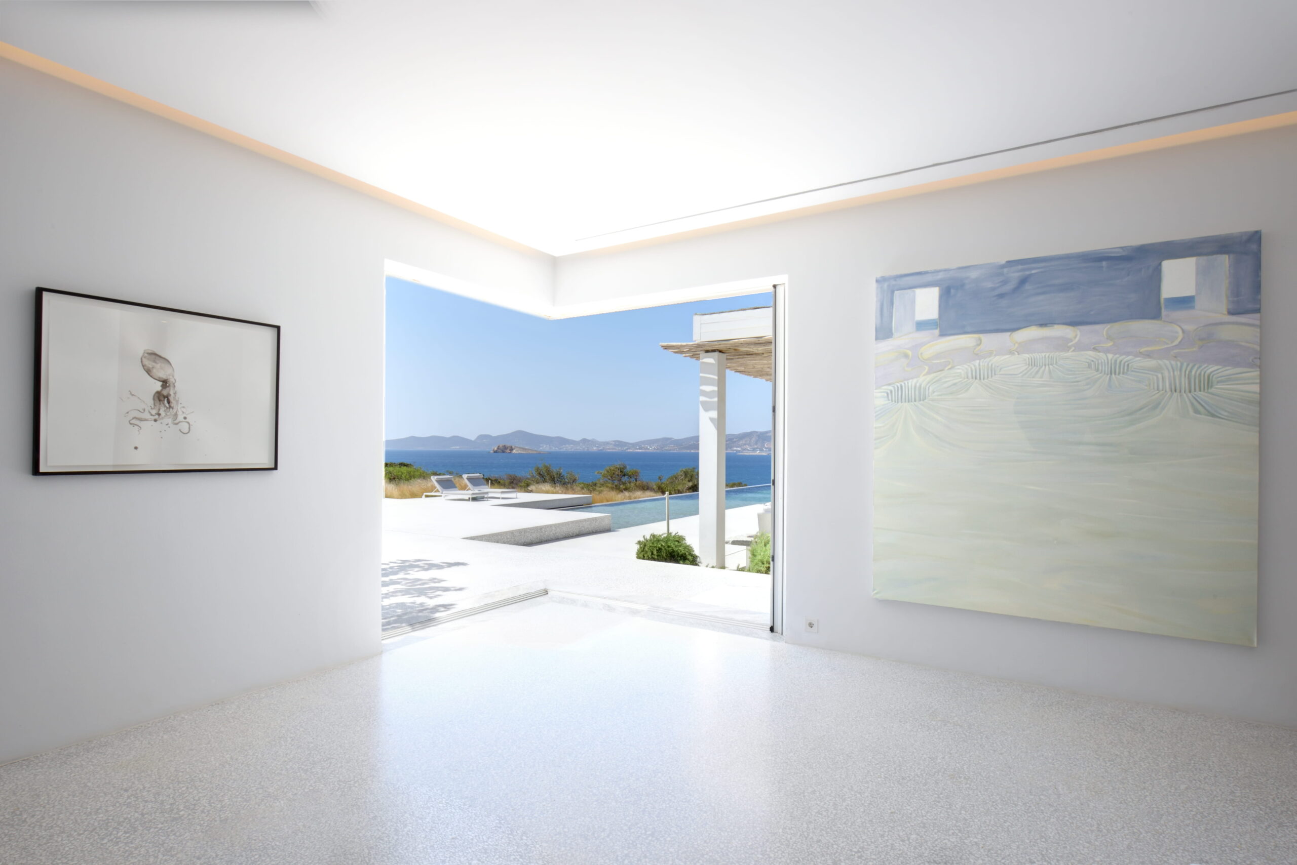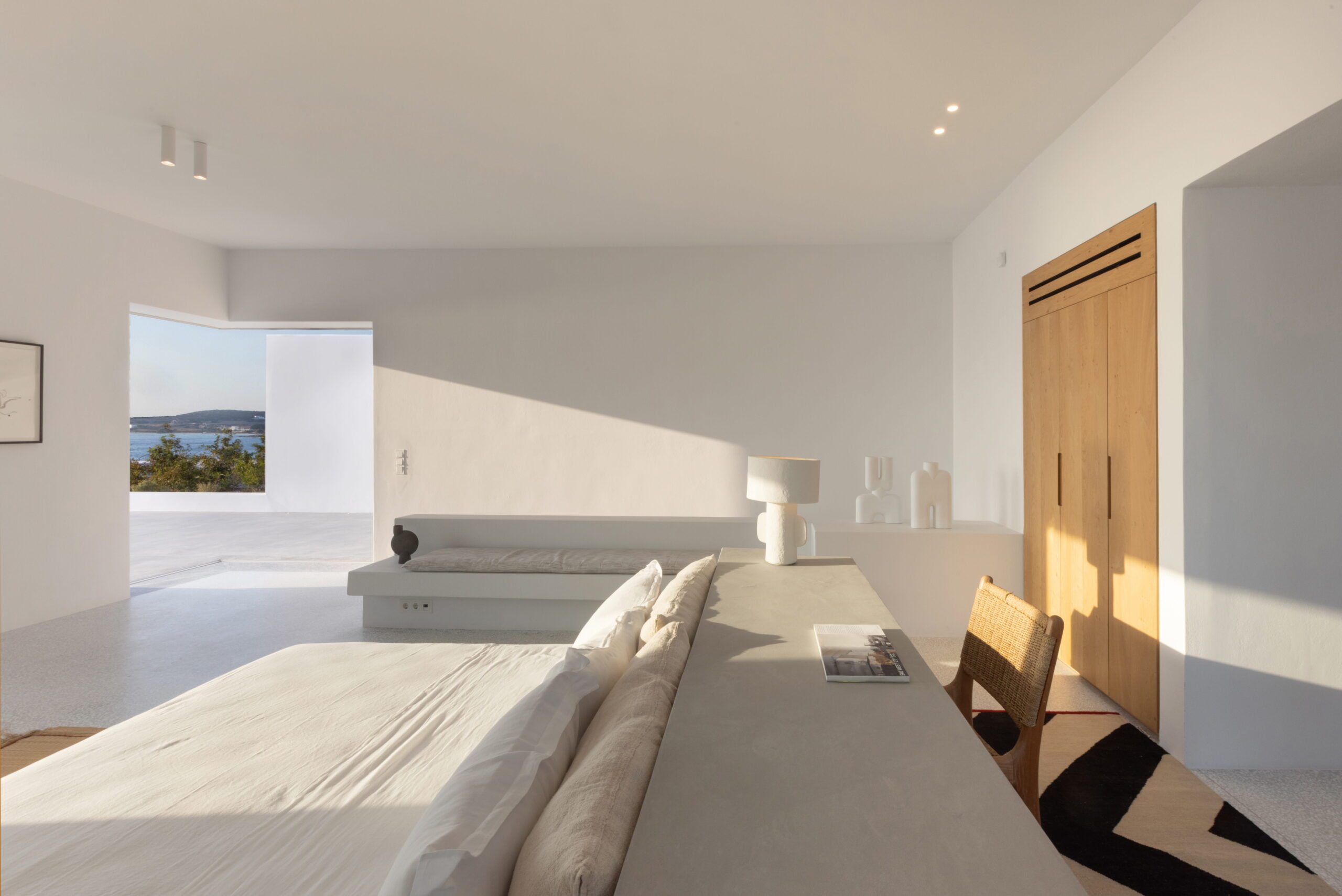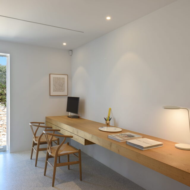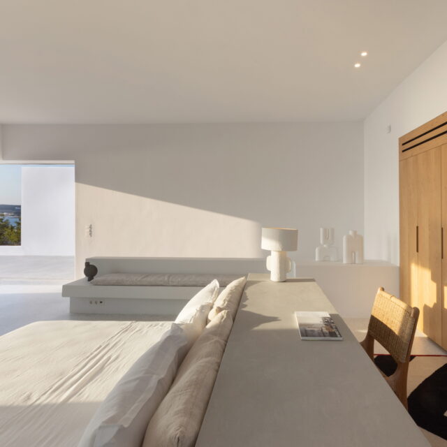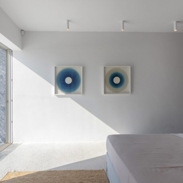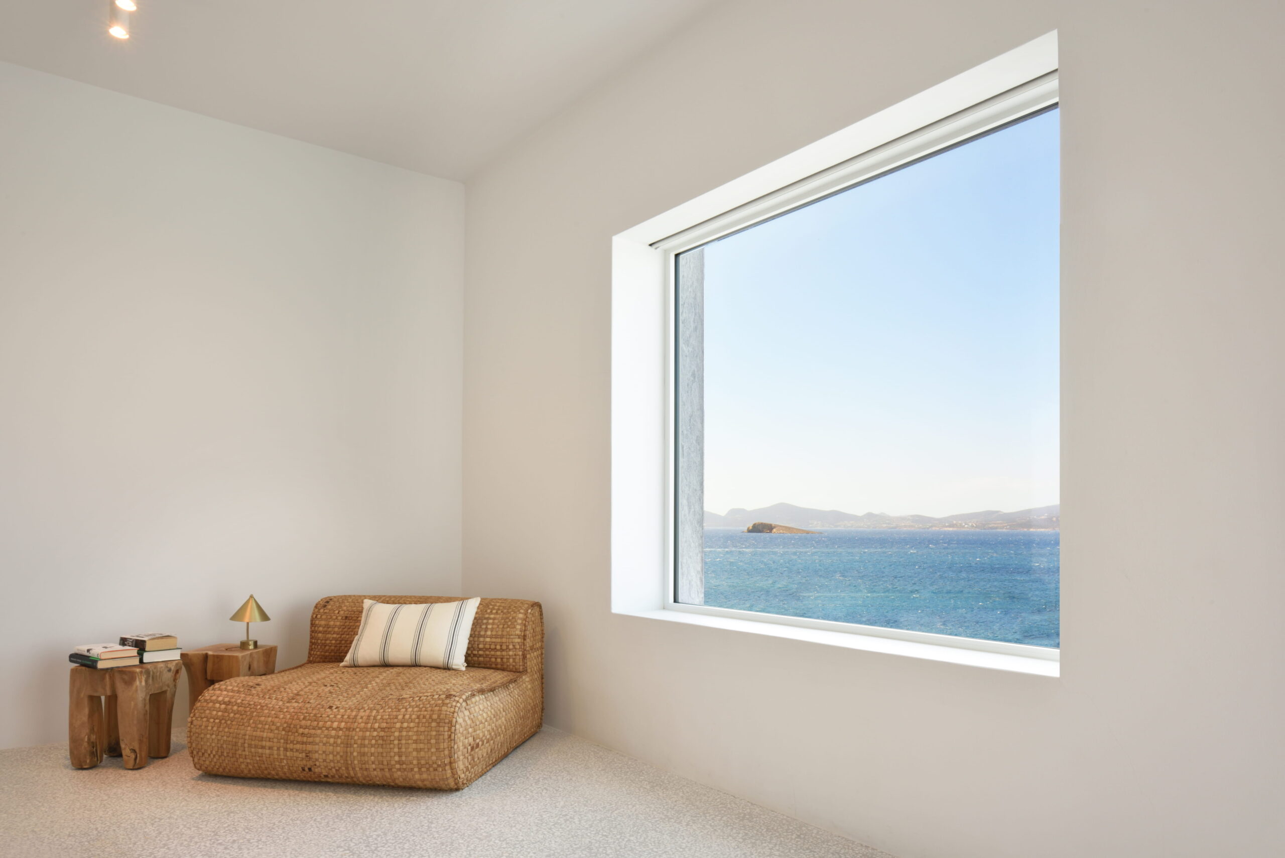 Just as the built elements are placed gently on the site, the material richness of the building is derived subtly by means of texture. Beyond the traditional white and stone walls, the materiality is augmented by Greek marble and terrazzo. The simplicity of these raw materials is the key to the intricacy of the project. The size of the stone aggregate displays calculated variation between different terrazzo surfaces, creating a subtle but vital gradation. The windows are framed by a densely hammered Aliveri marble, inspired by the decorative stone surround that marks the entrance of Parian churches, while counters and benches feature sandblasted and chiselled stone. These careful adjustments provide complexity without overloading the site, allowing the magic of the landscape to imbue the house with the unique energy for which we build by the seaside.
