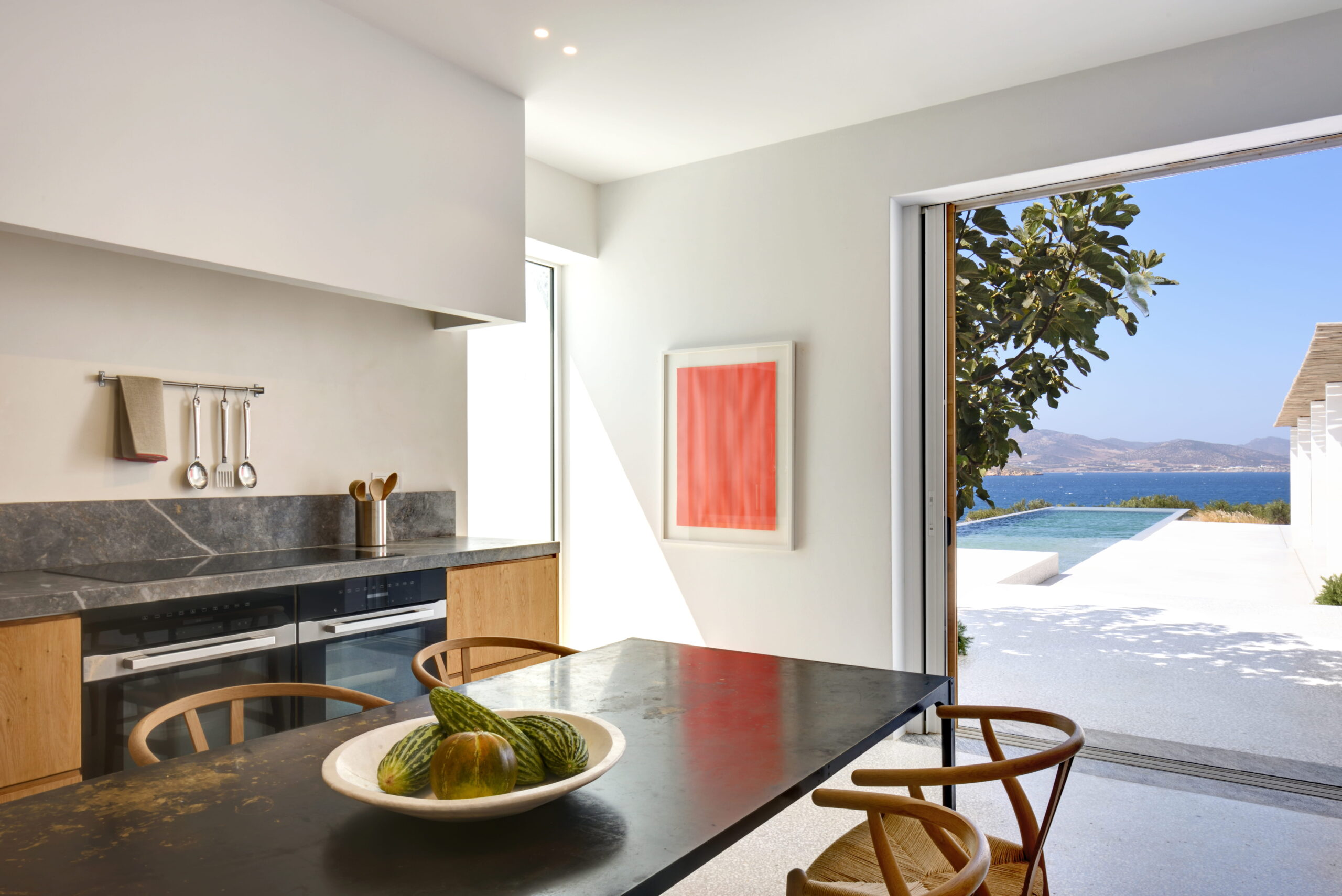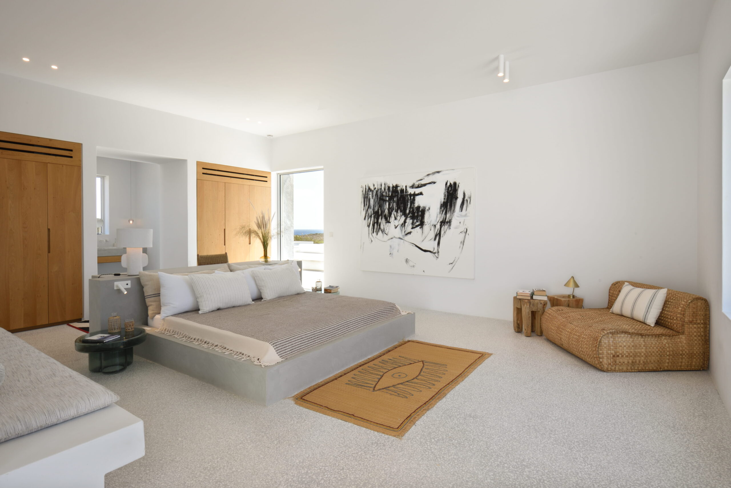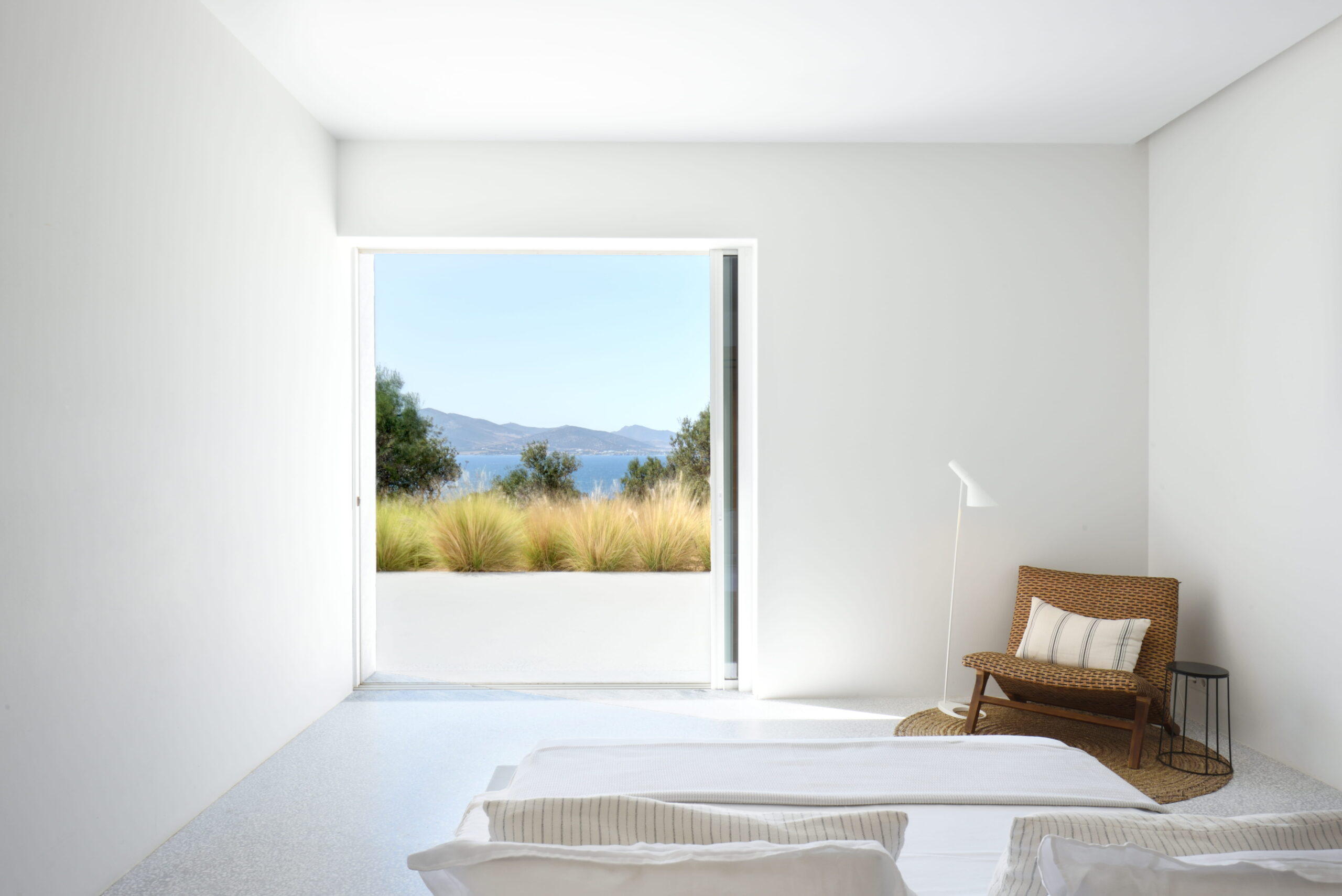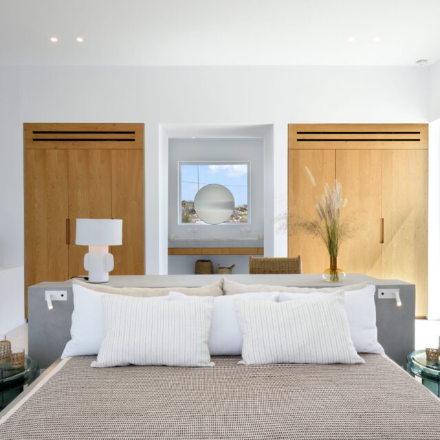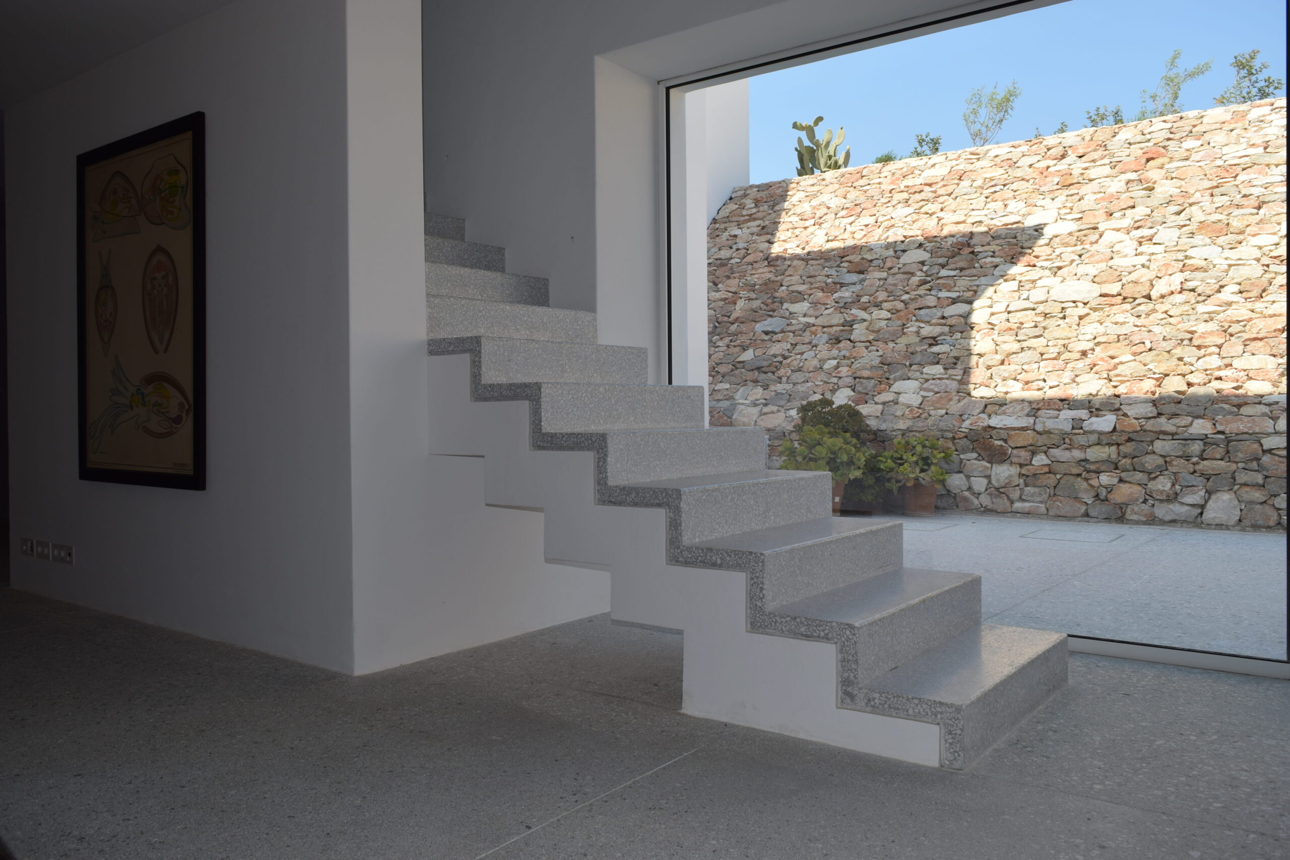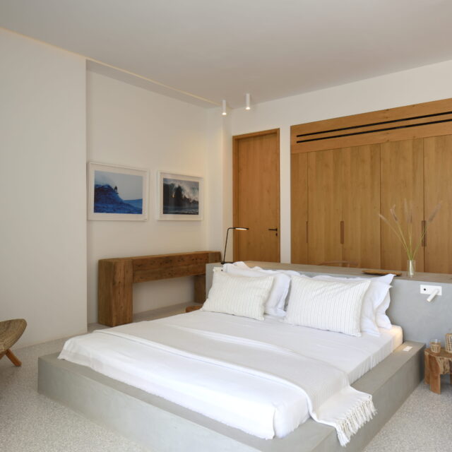 Just as the built elements are placed gently on the site, the material richness of the building is derived subtly by means of texture. Beyond the traditional white and stone walls, the materiality is augmented by Greek marble and terrazzo. The simplicity of these raw materials is the key to the intricacy of the project. The size of the stone aggregate displays calculated variation between different terrazzo surfaces, creating a subtle but vital gradation. The windows are framed by a densely hammered Aliveri marble, inspired by the decorative stone surround that marks the entrance of Parian churches, while counters and benches feature sandblasted and chiselled stone. These careful adjustments provide complexity without overloading the site, allowing the magic of the landscape to imbue the house with the unique energy for which we build by the seaside.