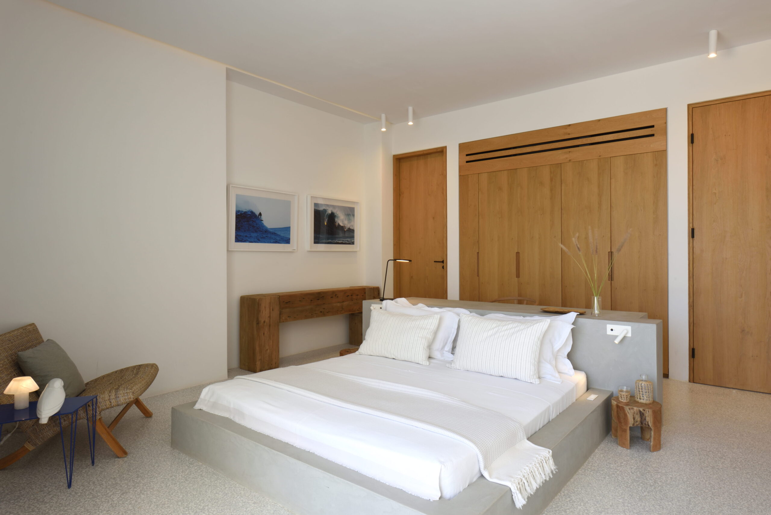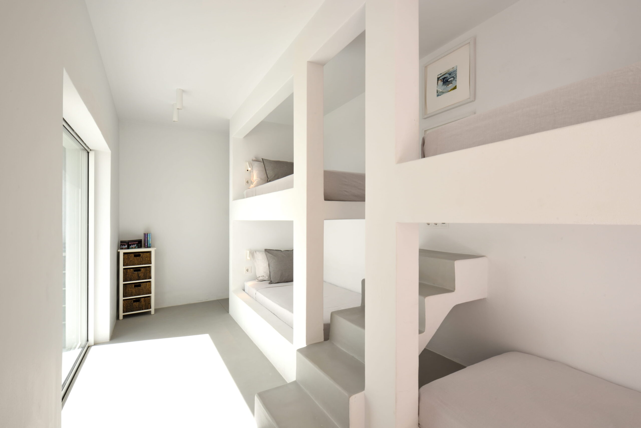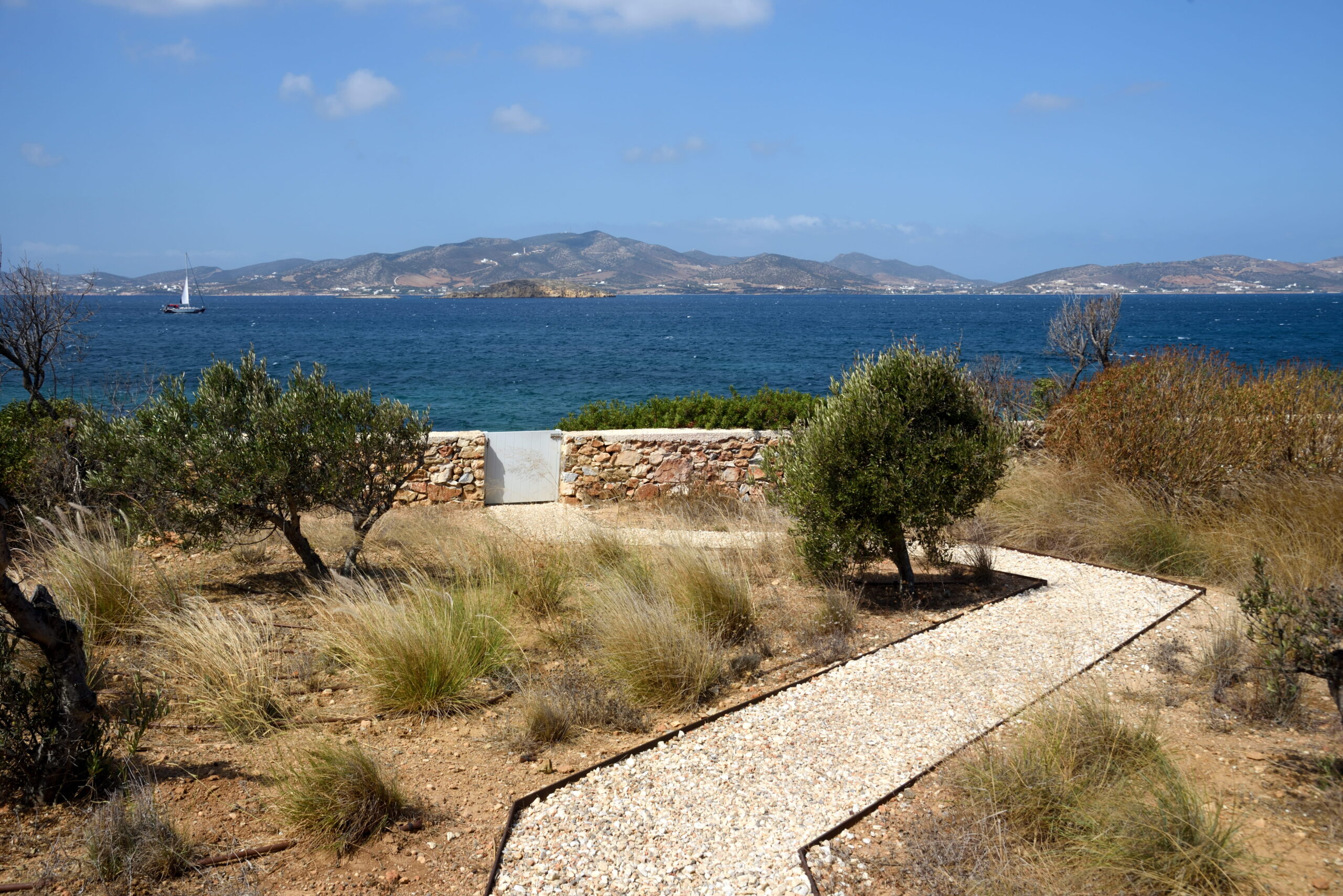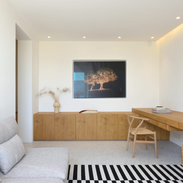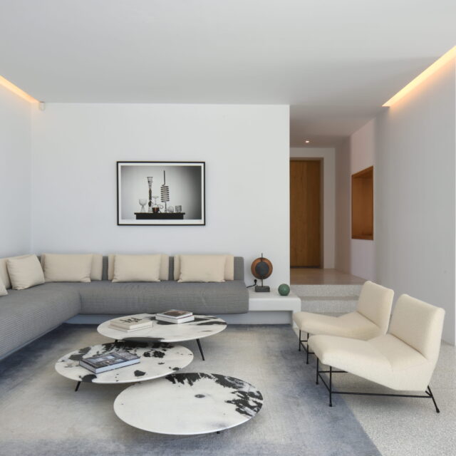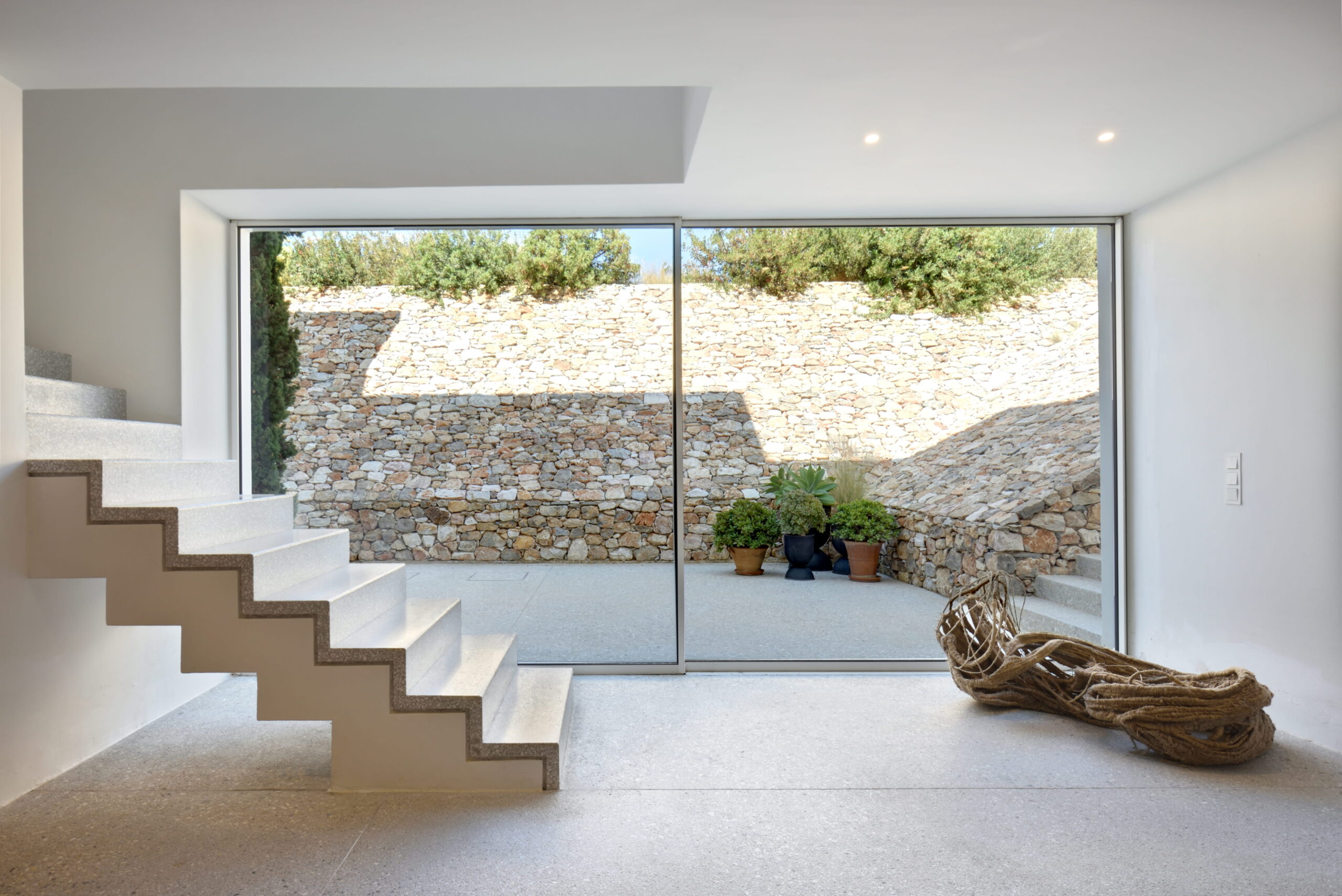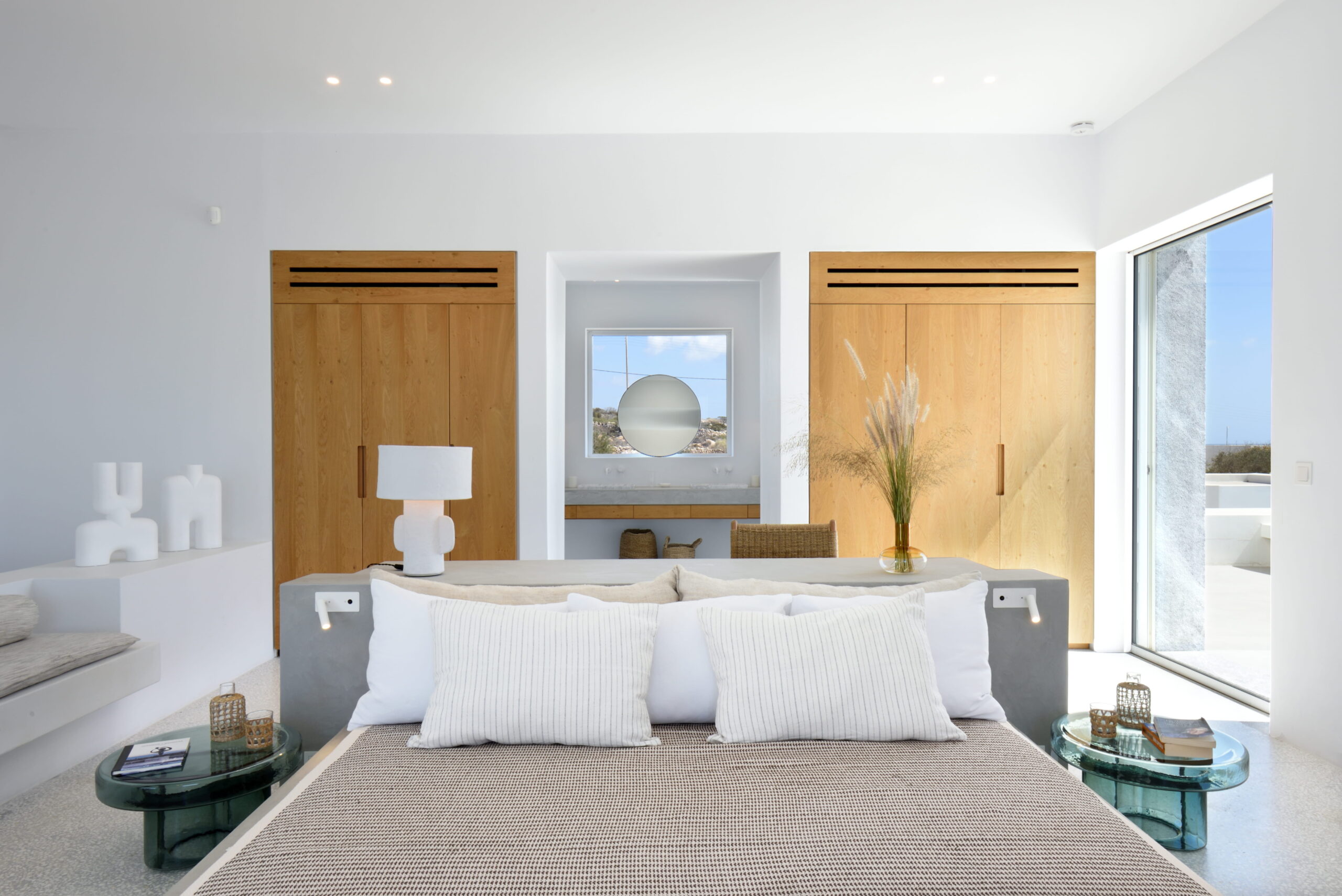 Just as the built elements are placed gently on the site, the material richness of the building is derived subtly by means of texture. Beyond the traditional white and stone walls, the materiality is augmented by Greek marble and terrazzo. The simplicity of these raw materials is the key to the intricacy of the project. The size of the stone aggregate displays calculated variation between different terrazzo surfaces, creating a subtle but vital gradation. The windows are framed by a densely hammered Aliveri marble, inspired by the decorative stone surround that marks the entrance of Parian churches, while counters and benches feature sandblasted and chiselled stone. These careful adjustments provide complexity without overloading the site, allowing the magic of the landscape to imbue the house with the unique energy for which we build by the seaside.
