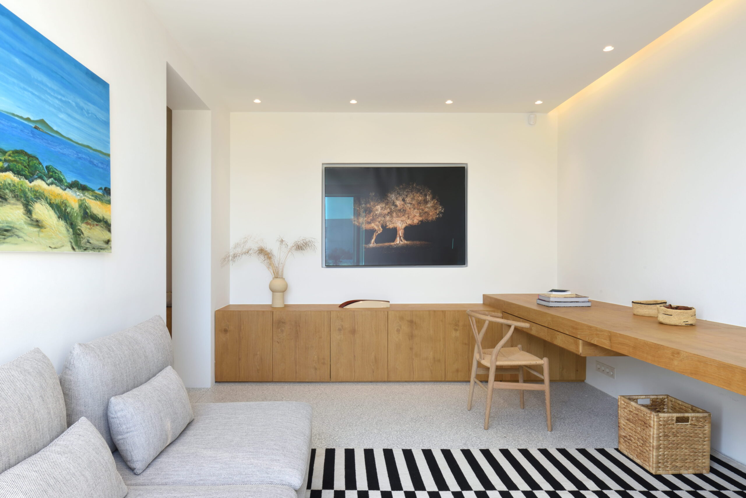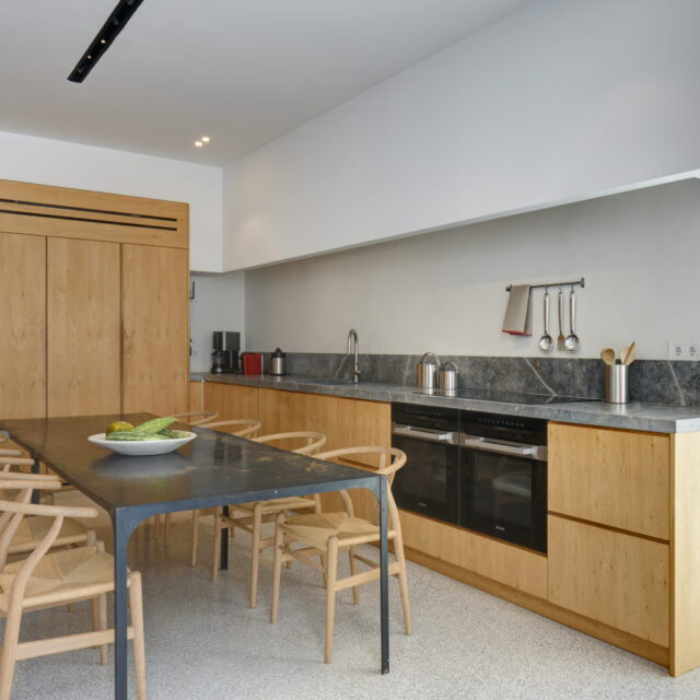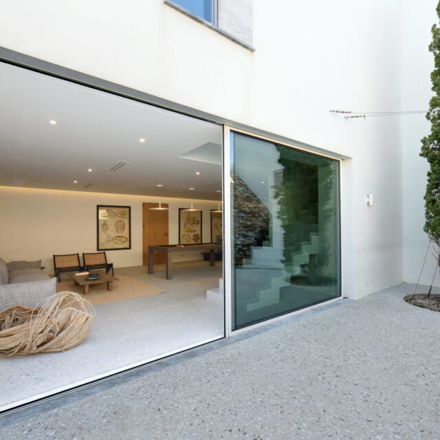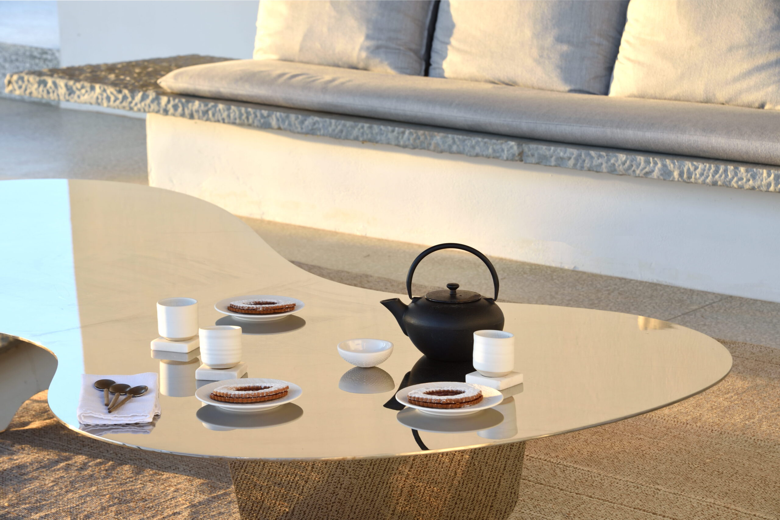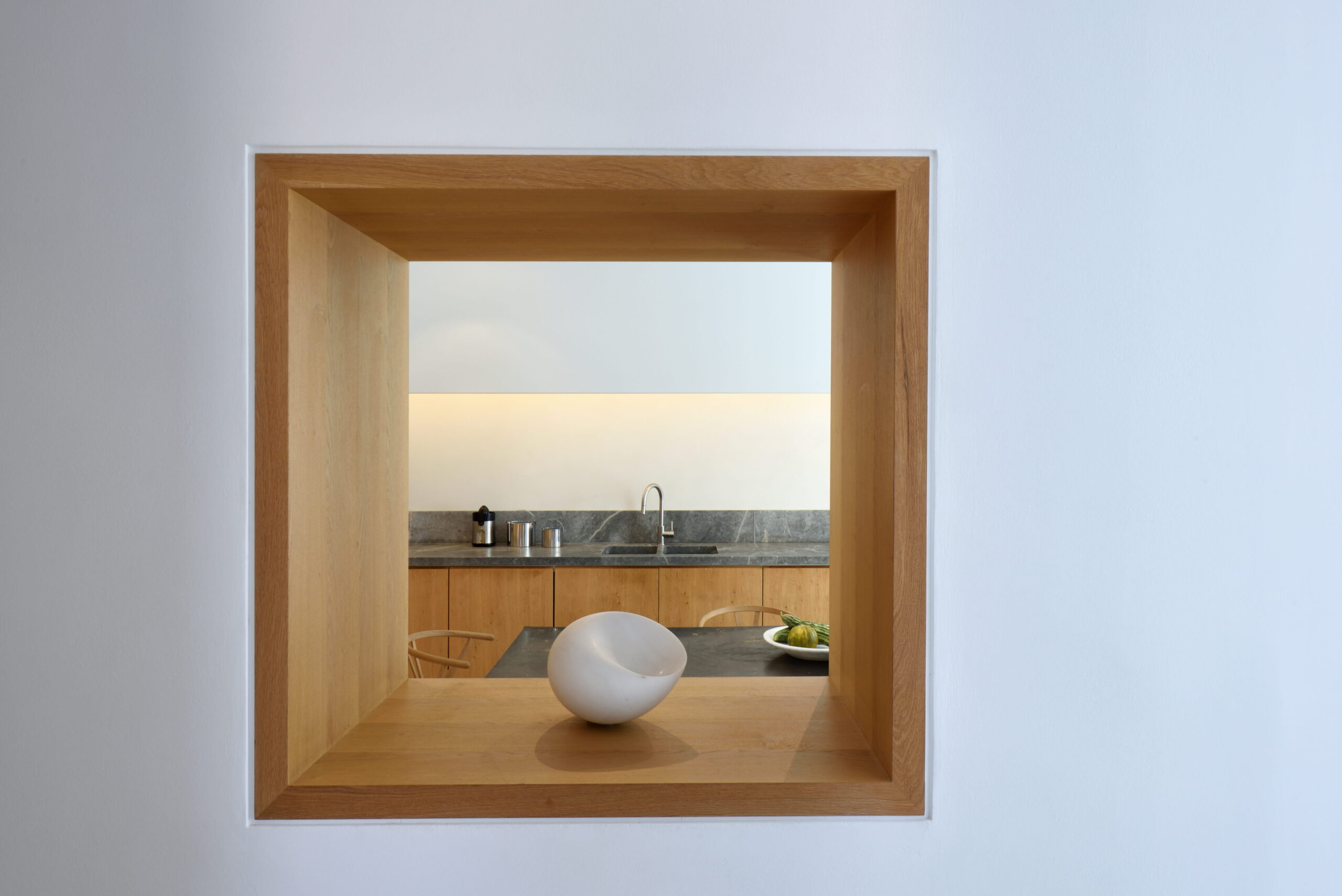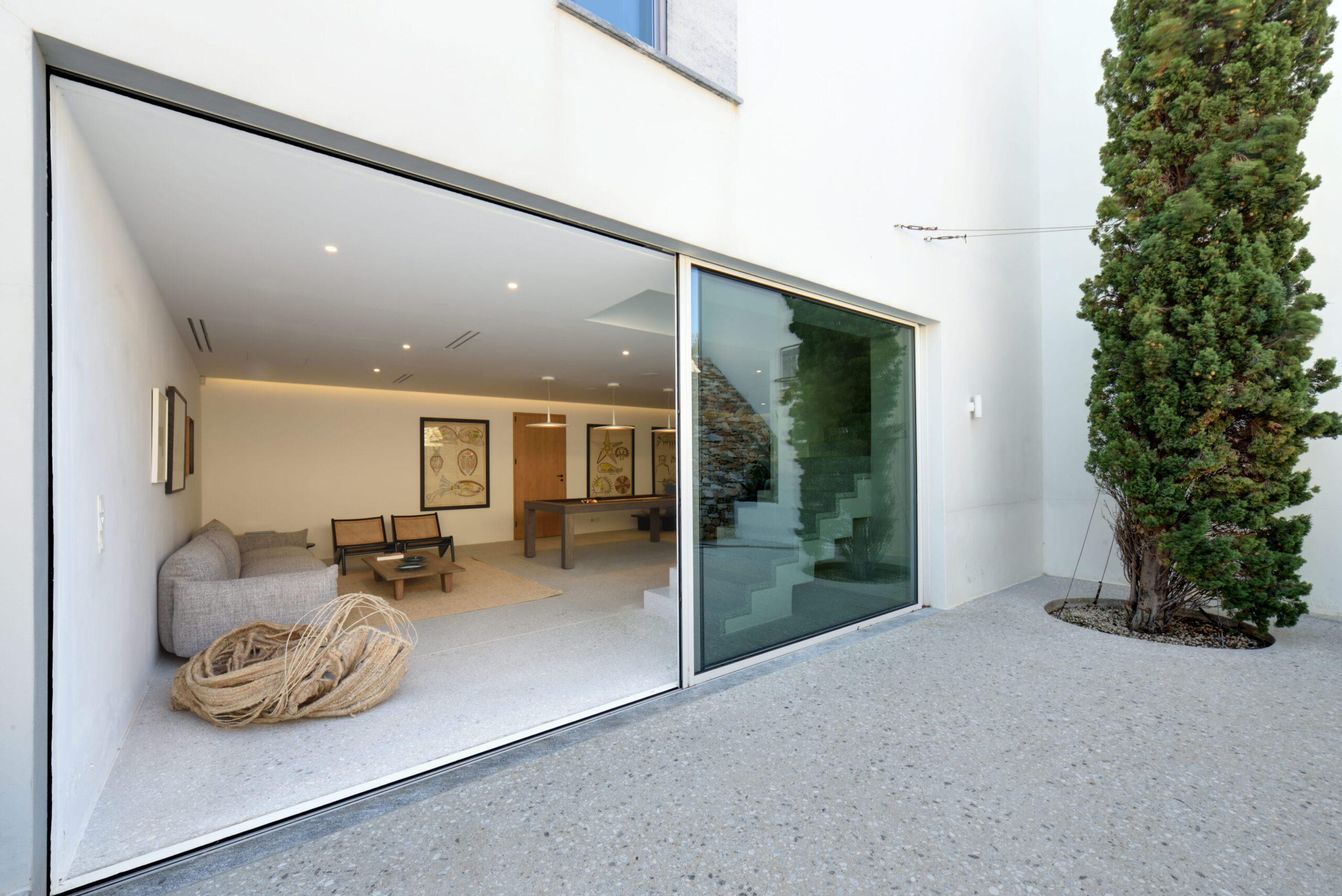 Just as the built elements are placed gently on the site, the material richness of the building is derived subtly by means of texture. Beyond the traditional white and stone walls, the materiality is augmented by Greek marble and terrazzo. The simplicity of these raw materials is the key to the intricacy of the project. The size of the stone aggregate displays calculated variation between different terrazzo surfaces, creating a subtle but vital gradation. The windows are framed by a densely hammered Aliveri marble, inspired by the decorative stone surround that marks the entrance of Parian churches, while counters and benches feature sandblasted and chiselled stone. These careful adjustments provide complexity without overloading the site, allowing the magic of the landscape to imbue the house with the unique energy for which we build by the seaside.
