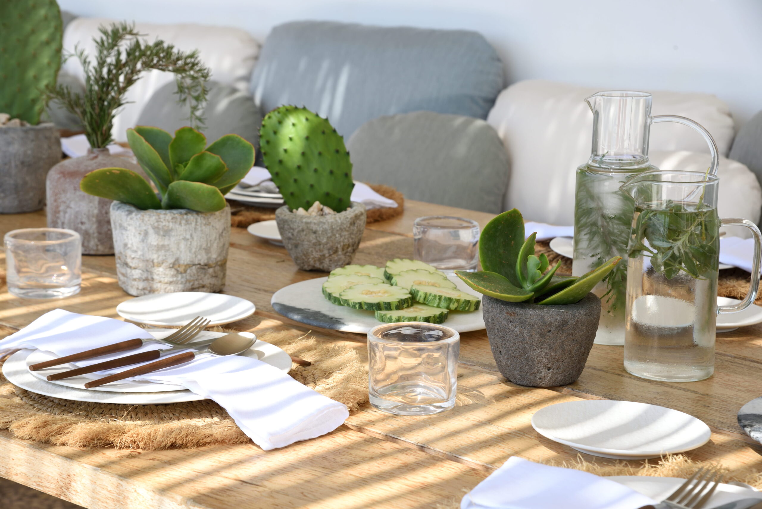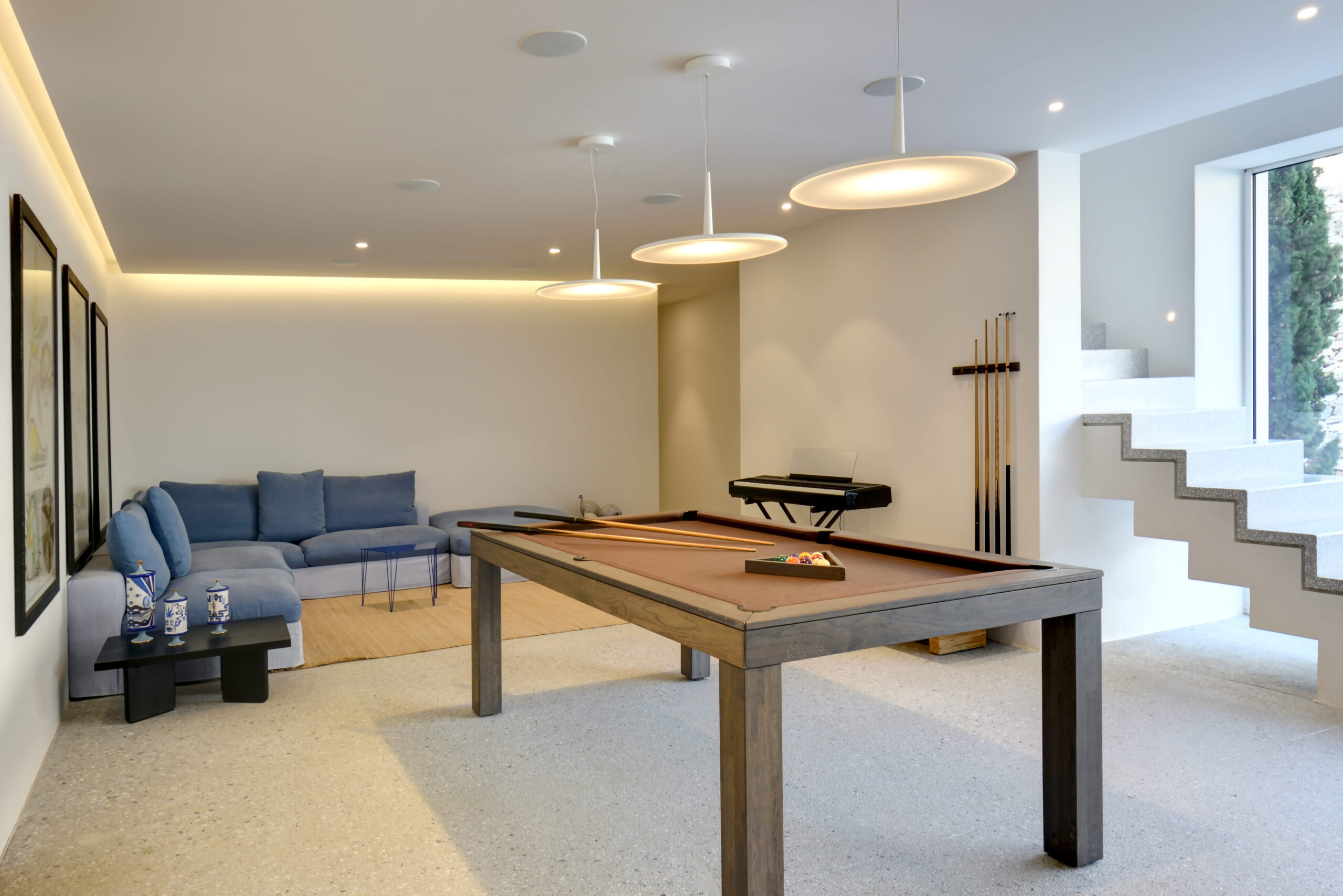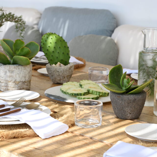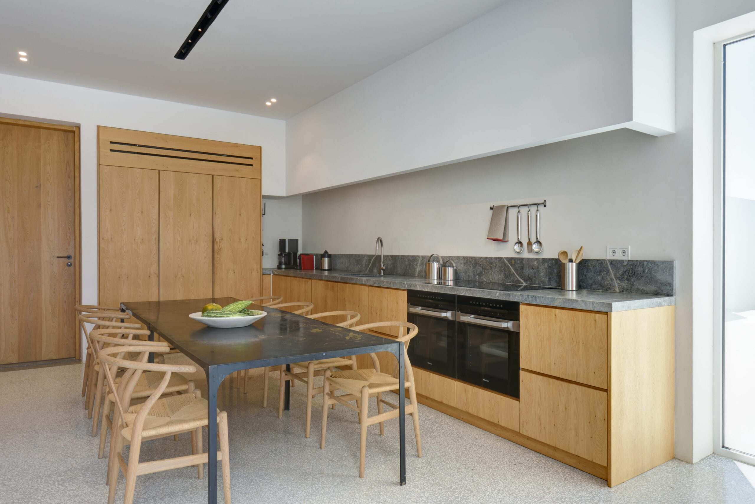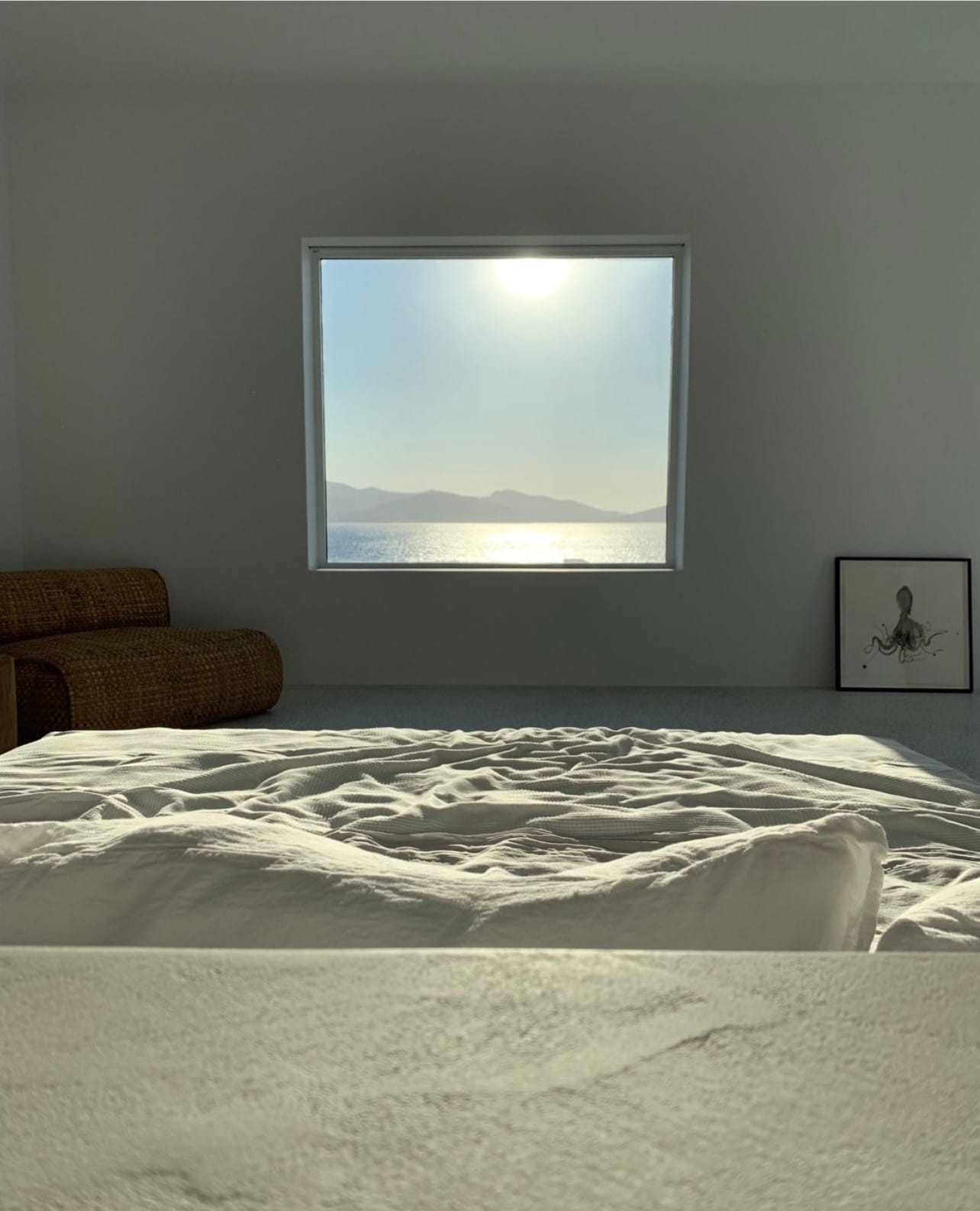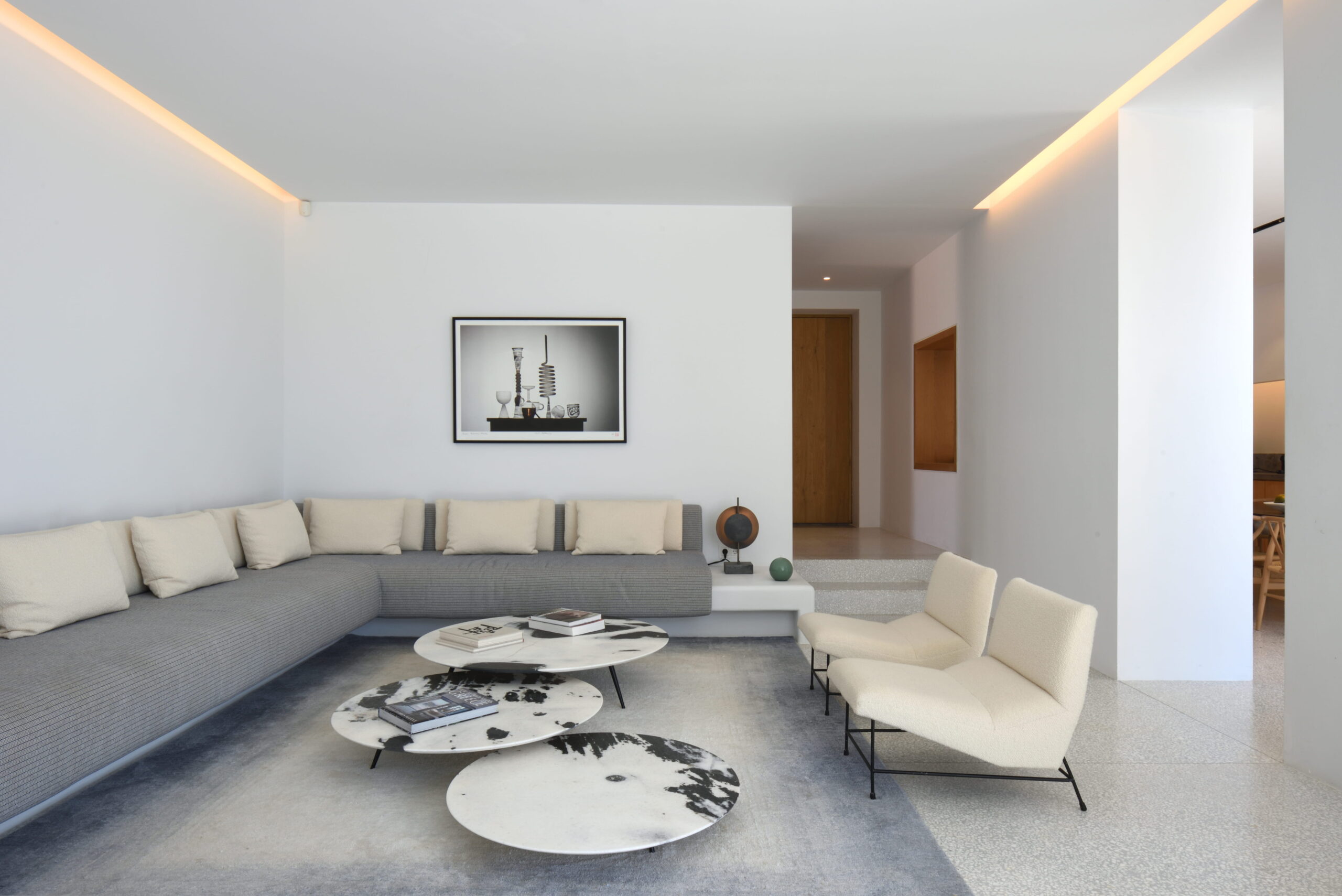 Just as the built elements are placed gently on the site, the material richness of the building is derived subtly by means of texture. Beyond the traditional white and stone walls, the materiality is augmented by Greek marble and terrazzo. The simplicity of these raw materials is the key to the intricacy of the project. The size of the stone aggregate displays calculated variation between different terrazzo surfaces, creating a subtle but vital gradation. The windows are framed by a densely hammered Aliveri marble, inspired by the decorative stone surround that marks the entrance of Parian churches, while counters and benches feature sandblasted and chiselled stone. These careful adjustments provide complexity without overloading the site, allowing the magic of the landscape to imbue the house with the unique energy for which we build by the seaside.